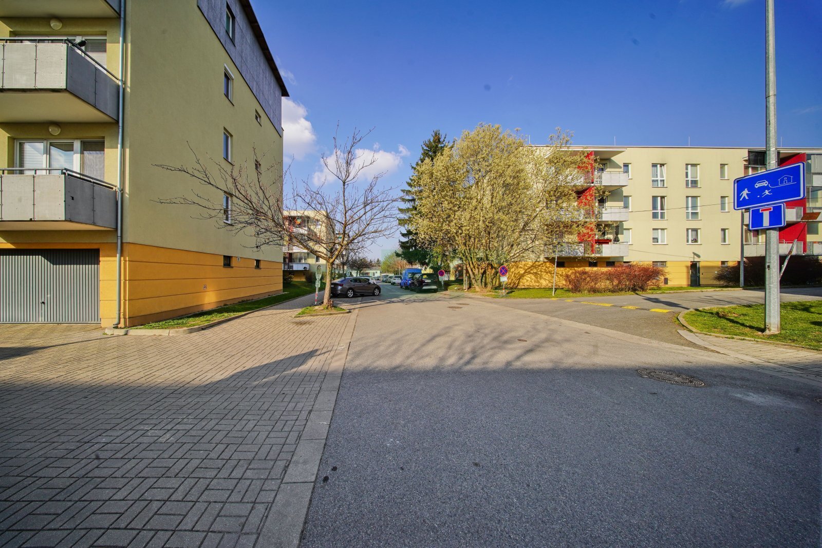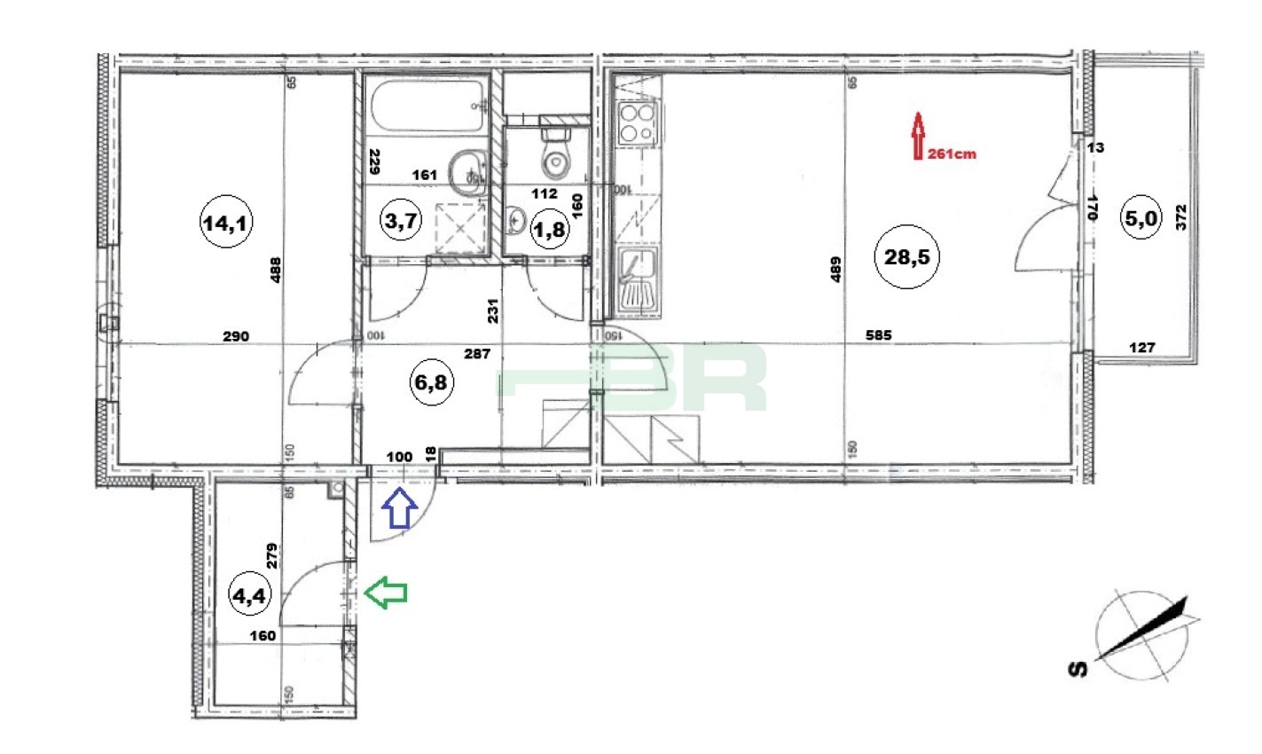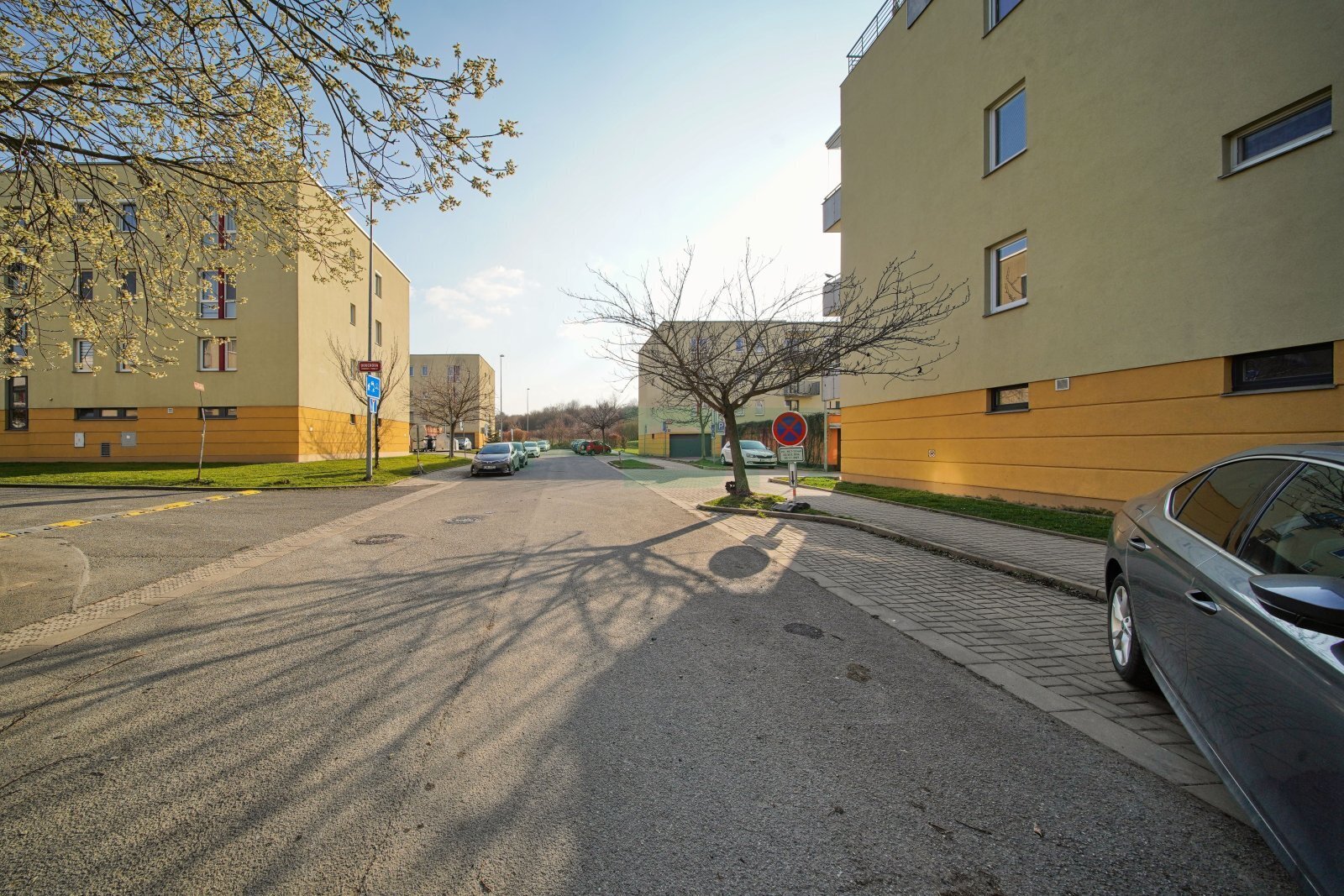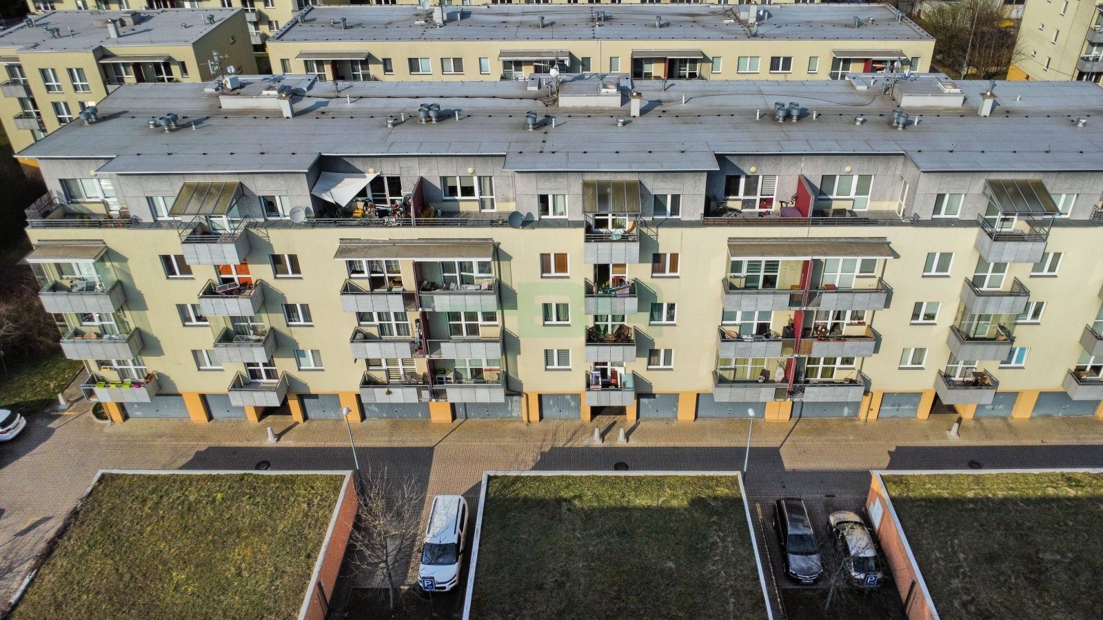 Byt 2+kk (54,9 m2) se zastřešeným balkonem (5 m2), komorou před bytem (4,4 m2) a garáží (2,84 x 5,85 = 16,6 m2) přímo před vchodem (+ 2.500,-Kč/měs.). 1. patro ze 4 s výtahem. Parapety 385 cm na úrovní!