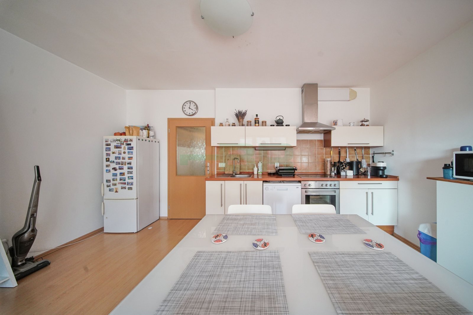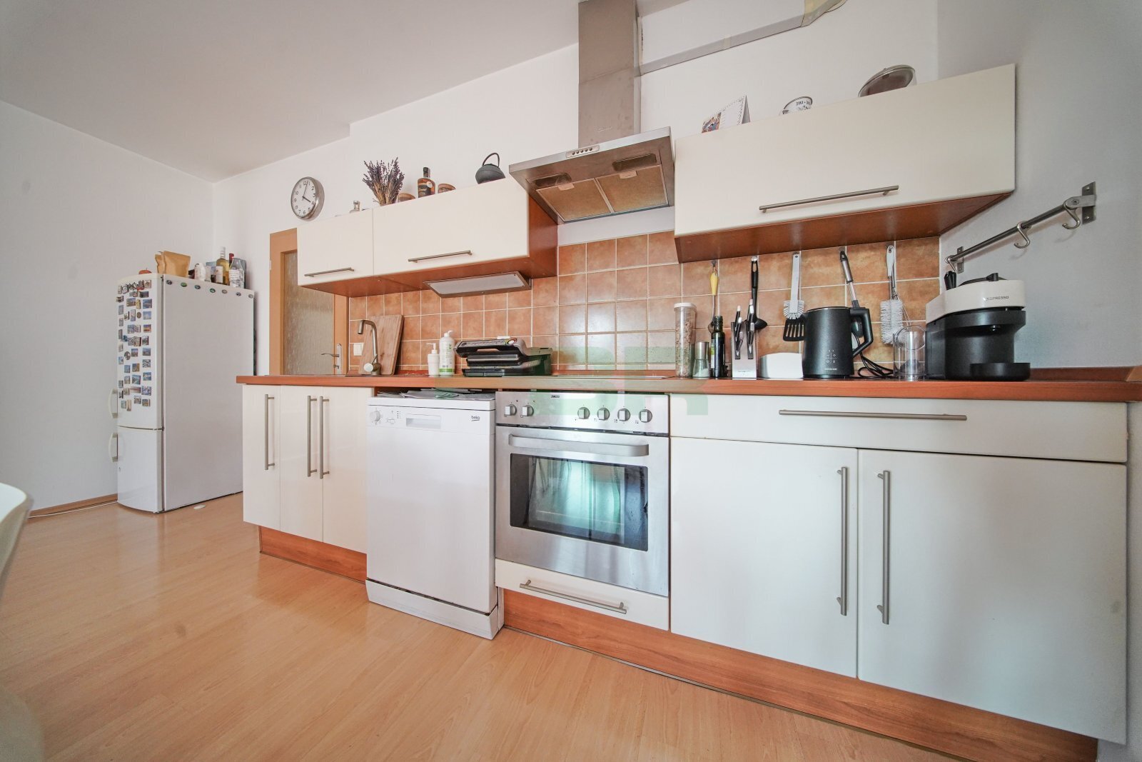 Velké šatní skříně, věšáky a botník v předsíni. Po dohodě může zůstat také další nábytek viz fotografie. Kuchyňská linka s vestavěnou indukční deskou, horkovzdušnou troubou, myčkou a digestoří s odtahem a samostatně stojící lednice s mrazákem.
