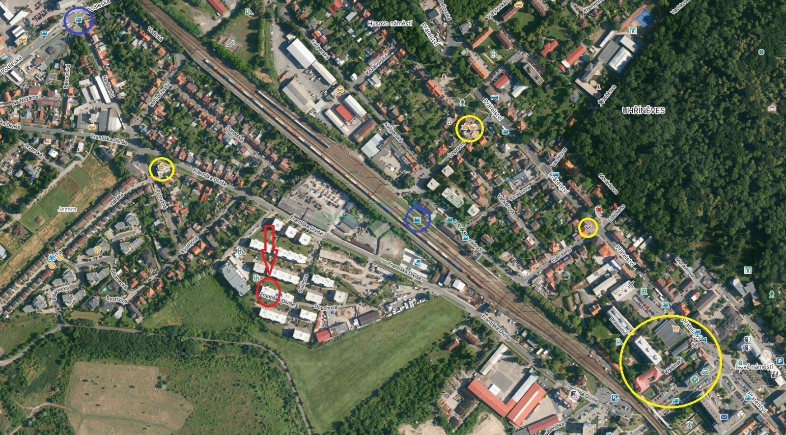 Absolutní klid, množství zeleně, pěkný výhled a výborná dostupnost MHD (5 min. vlakem na |M| Hostivař, 11 min. do Vršovic a 18 min. na |M| Hlavní nádraží – vlaková stanice 550 m od domu , nebo 79 minut busem na |M| Háje - zastávka 870 m od domu).