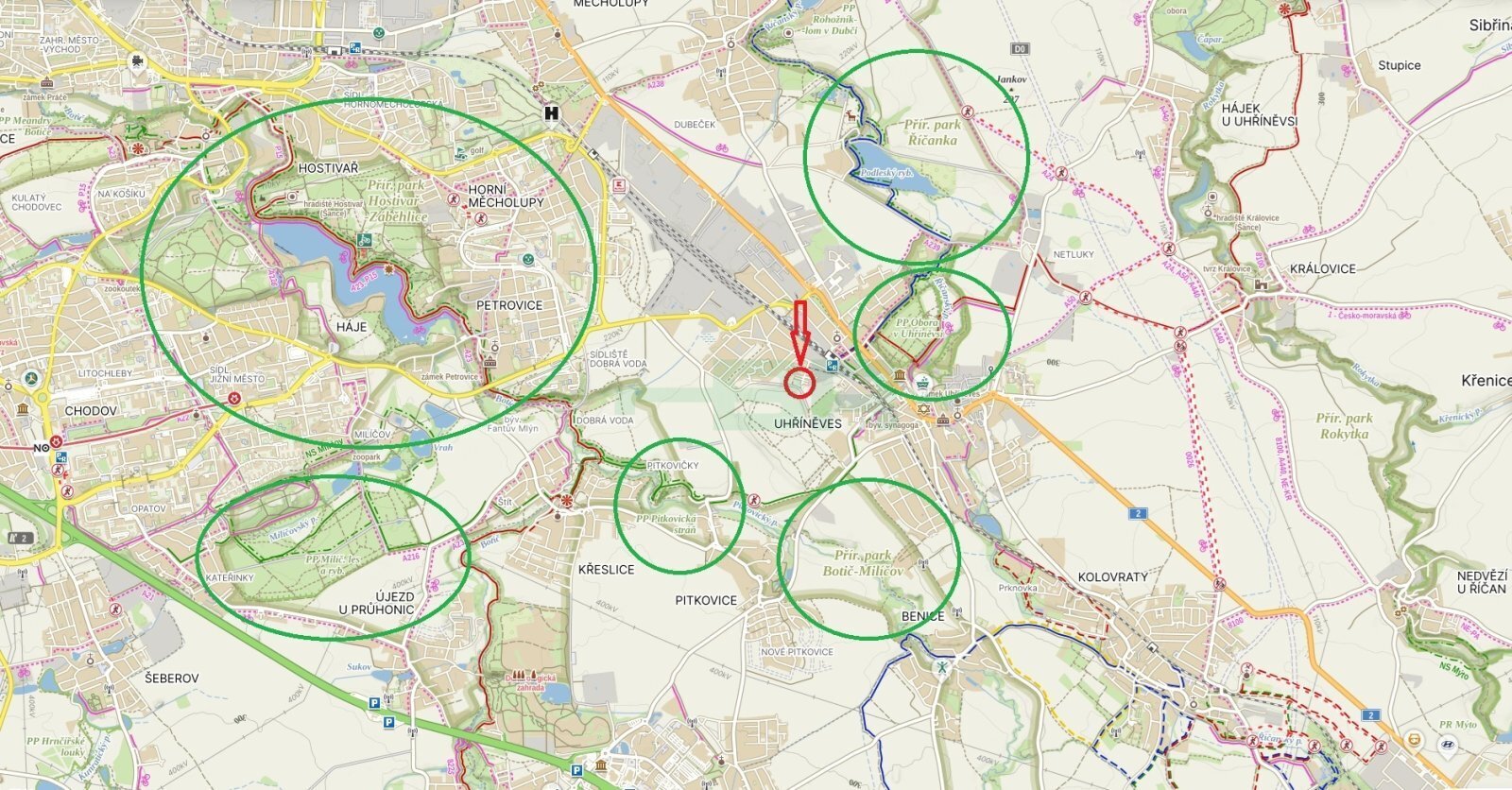Krásné okolí s plnou občanskou vybaveností a sportovního vyžití. Cyklostezka A (Uhříněves) 500 m od domu a o dalších 300 m dále začíná Přírodní park Obora v Uhříněvsi. V blízkém okolí další přírodní parky včetně Hostivařské přehrady – protkané cyklostezkami. Přímo za domem množství zeleně ideální k procházkám.