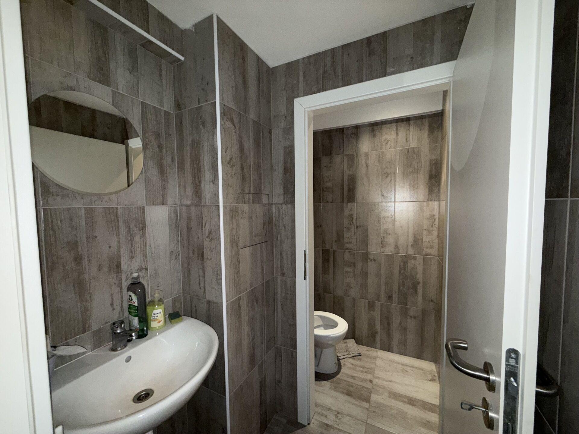 zázemí přístupné z hlavní části, kde se nachází toaleta a úklidová místnost nebo kuchyňka