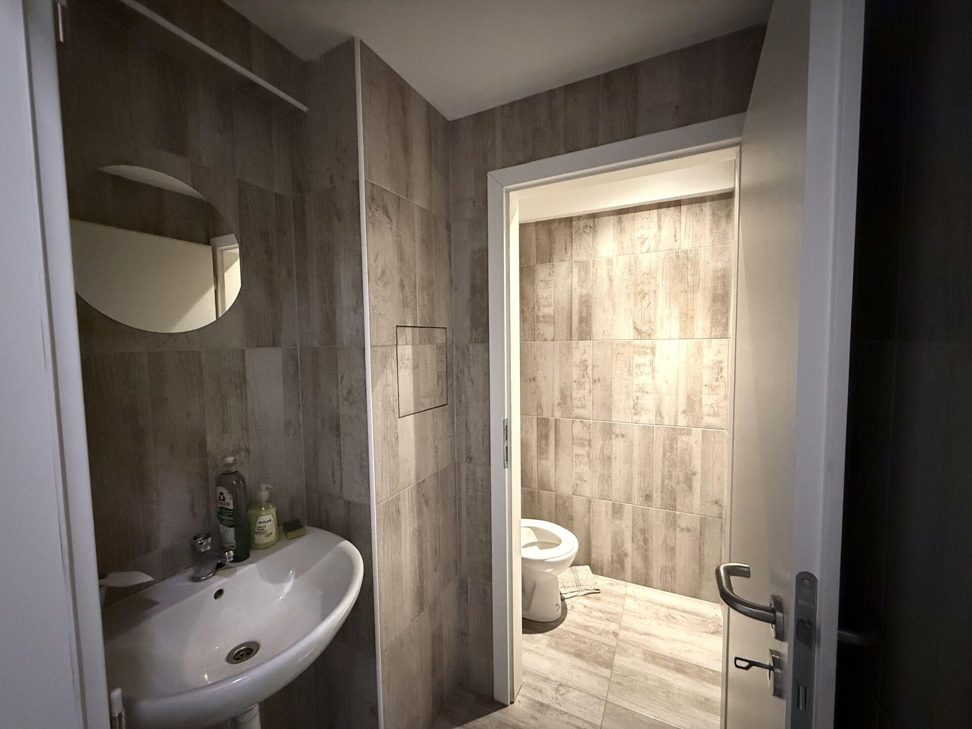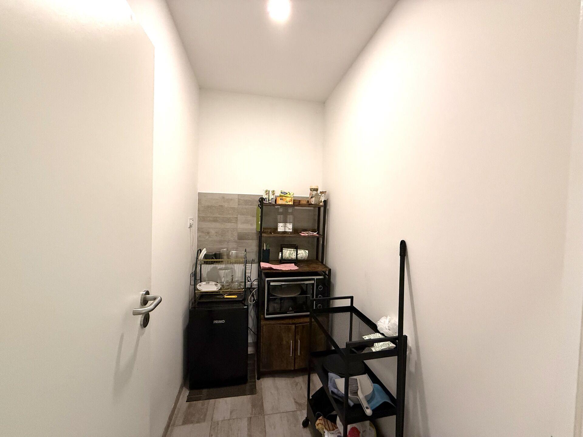 zázemí přístupné z hlavní části, kde se nachází toaleta a úklidová místnost nebo kuchyňka