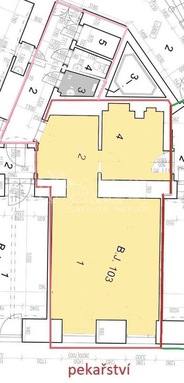Prostor má výměru 46 m2 a sestává se ze tří místností (v plánku označeno žlutě) - prodejny (24 m2) a 2 zadních místností (po asi 7 m2). Toaleta s umyvadlem, malý sklad a chodba je ve společném užívaní s dalším nebytovým prostorem. Prostor prošel částečnou rekonstrukcí - rozvody elektřiny, vody, odpadu, omítek.