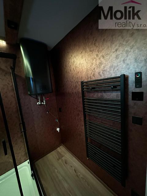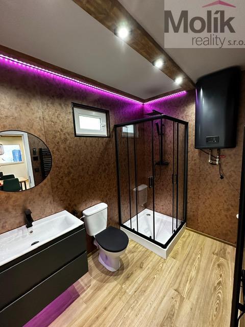 Modul disponuje koupelnou s umyvadlem a skříňkou, WC a sprchovým koutem 90×90 cm.