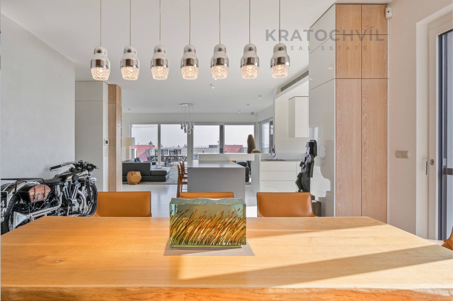 Rozloha samotného bytu činí 231 m², k tomu se přidává terasa o úctyhodných 118 m², která obklopuje celý byt a díky své orientaci na všechny světové strany nabízí výhledy, které se mění s každou denní dobou. Ranní slunce, polední klid i večerní panorama města – to vše z pohodlí vašeho soukromého prostoru.
