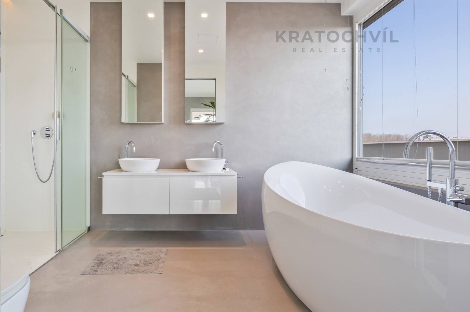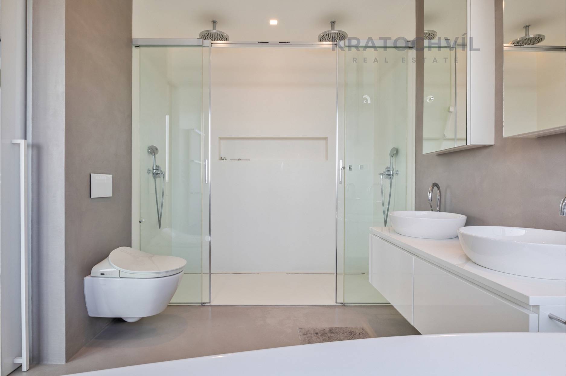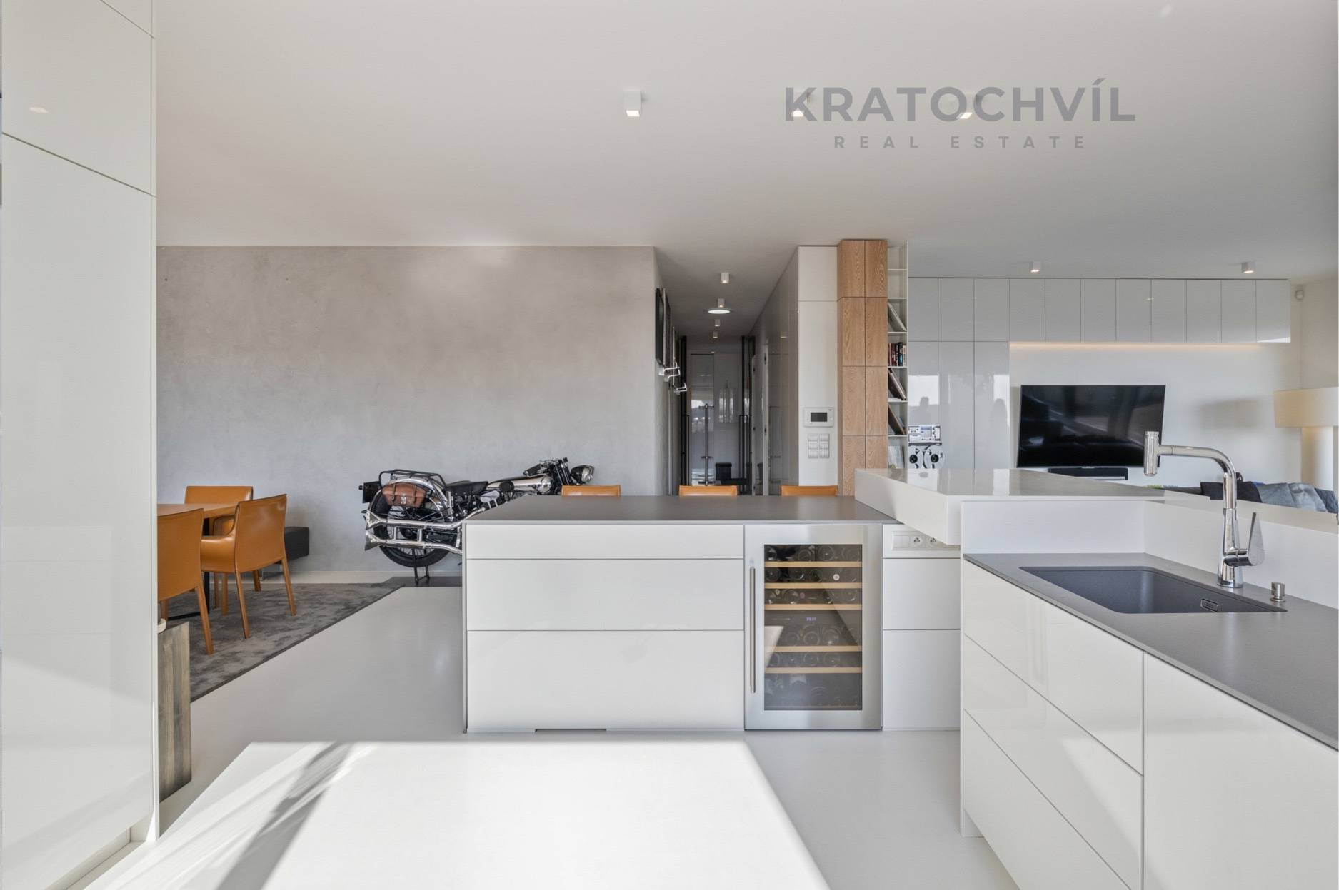 Dominantou interiéru jsou lité podlahy s bílým povrchem, moderní stěrky v betonovém designu na stěnách, vysoké vestavěné skříně na míru v celém bytě a plissé rolety pro jemnou regulaci světla. Důmyslný systém rekuperace a klimatizace zajišťuje ideální mikroklima po celý rok. Výtah vede přímo do bytu, což umocňuje pocit soukromí a exkluzivity.