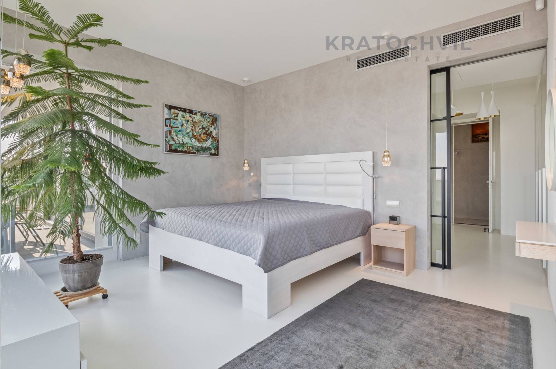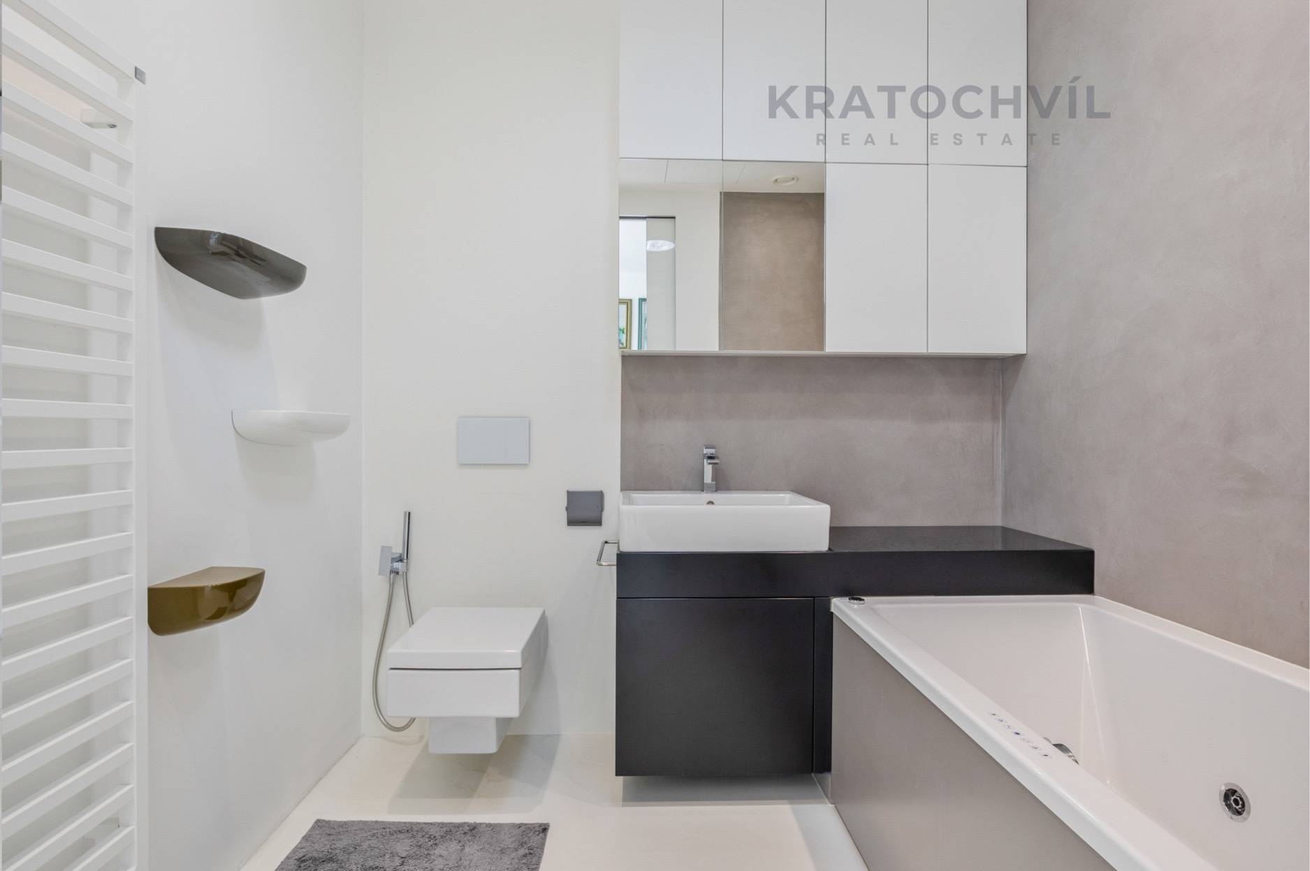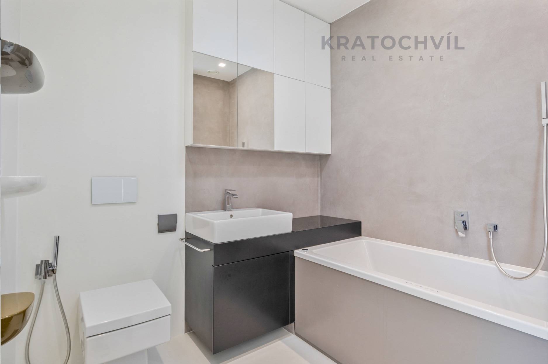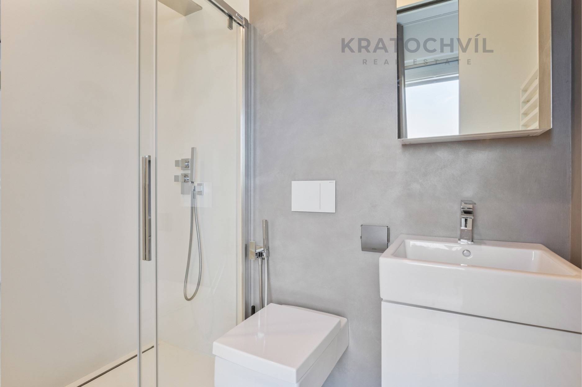 Dominantou interiéru jsou lité podlahy s bílým povrchem, moderní stěrky v betonovém designu na stěnách, vysoké vestavěné skříně na míru v celém bytě a plissé rolety pro jemnou regulaci světla. Důmyslný systém rekuperace a klimatizace zajišťuje ideální mikroklima po celý rok. Výtah vede přímo do bytu, což umocňuje pocit soukromí a exkluzivity.