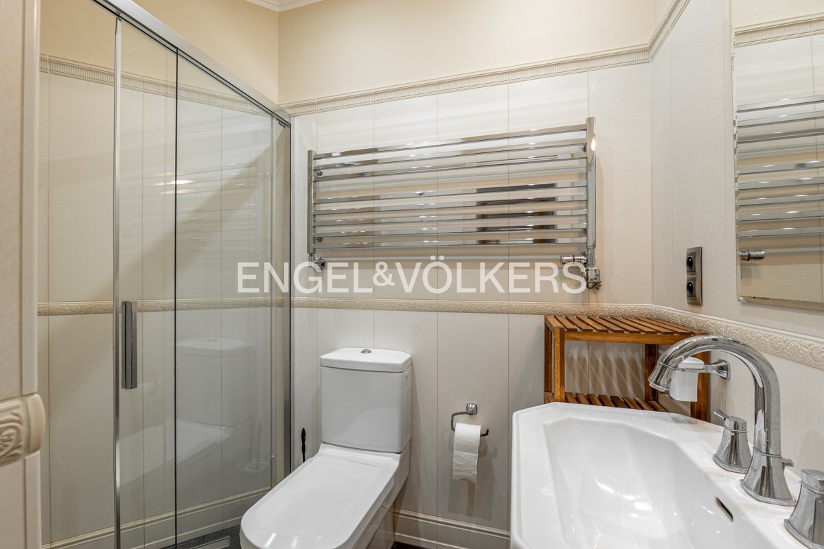 Dispozici bytu tvoří vstupní hala, samostatná kuchyně na míru vybavená spotřebiči značky Bauknecht a americkou lednicí, dále prostorný obývací pokoj a tři samostatné pokoje. Hlavní ložnice je krásně světlá s výhledem do ulice Široká, druhá ložnice disponuje en suite koupelnou a balkonem orientovaným do klidného vnitrobloku. Třetí pokoj je průchozí a je možné jej využít jako pracovnu.