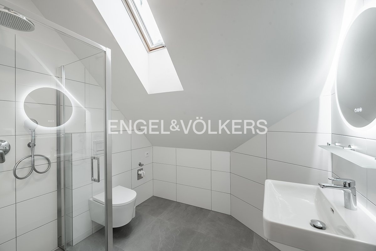 Díky střešním oknům je byt velmi světlý a působí vzdušně. Klimatizace zajišťuje komfortní bydlení i v letních měsících.