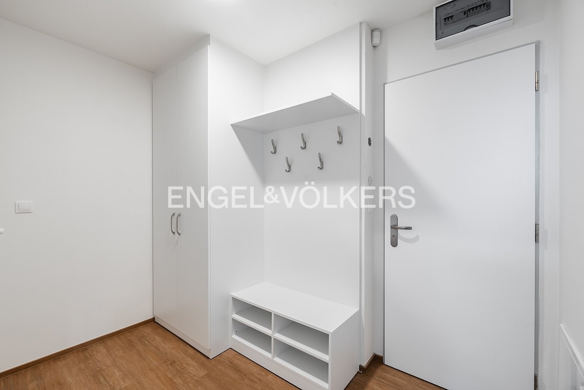 Byt má praktickou dispozici — ze vstupní předsíně s úložnými prostory se vchází do jednotlivých místností. Hlavní obytný prostor tvoří obývací pokoj s plně vybavenou kuchyní a samostatná ložnice.
