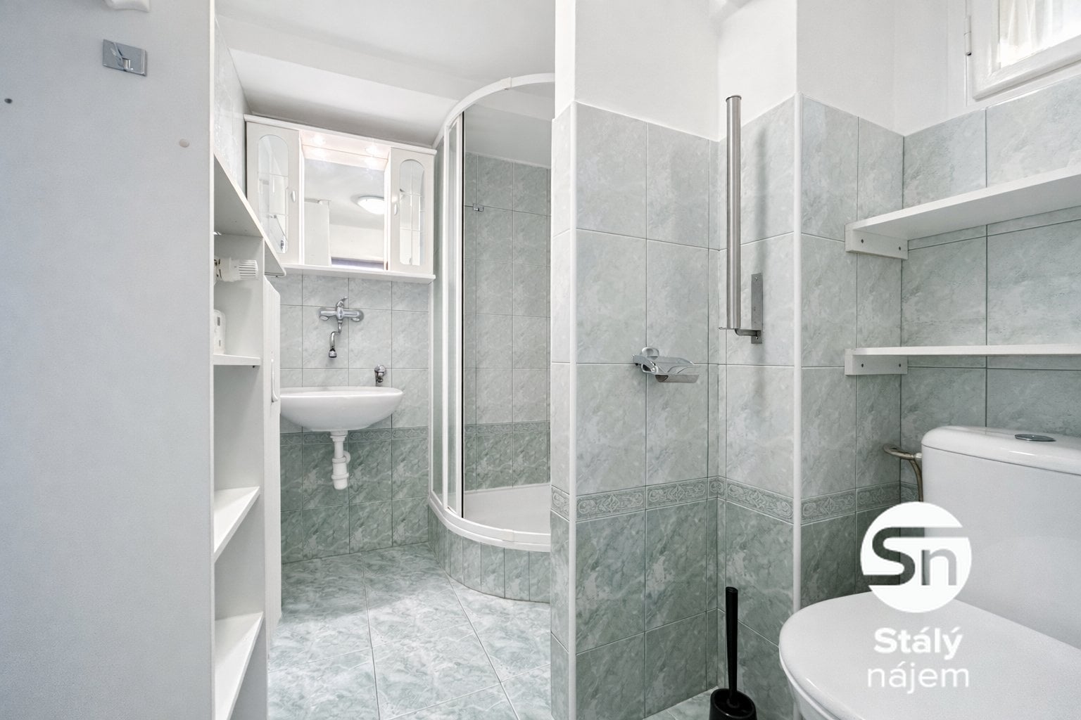Interiér tvoří prostorný pokoj, který lze chytře opticky rozdělit na spací a obývací zónu. Samostatná kuchyně je vybavena linkou se spotřebiči (lednice, mrazák, pračka, elektrický sporák, mikrovlnná trouba). V koupelně najdete sprchový kout a toaletu, zatímco předsíň nabízí praktické úložné prostory v podobě velké skříně a botníku. Domácí mazlíčci jsou v bytě vítáni.