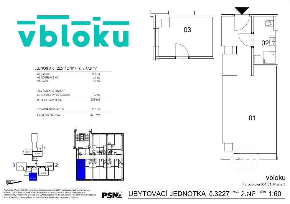 Byt je součástí moderní rezidence Vbloku, která nabízí řadu benefitů. V rámci ceny podnájmu můžete využívat dvě fitness zóny přímo v budově, relaxační zónu s krbem, TV místnost a zahradu s grilem. Za malý poplatek lze využít i prádelnu a sušárnu přímo v budově. Recepce funguje 24/7, což zajišťuje maximální komfort a bezpečnost.