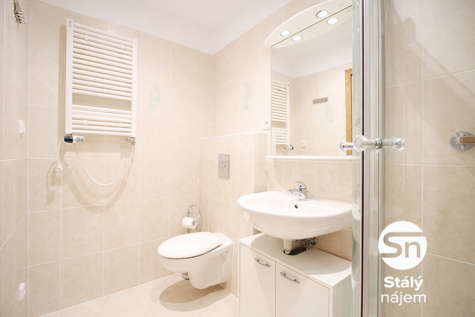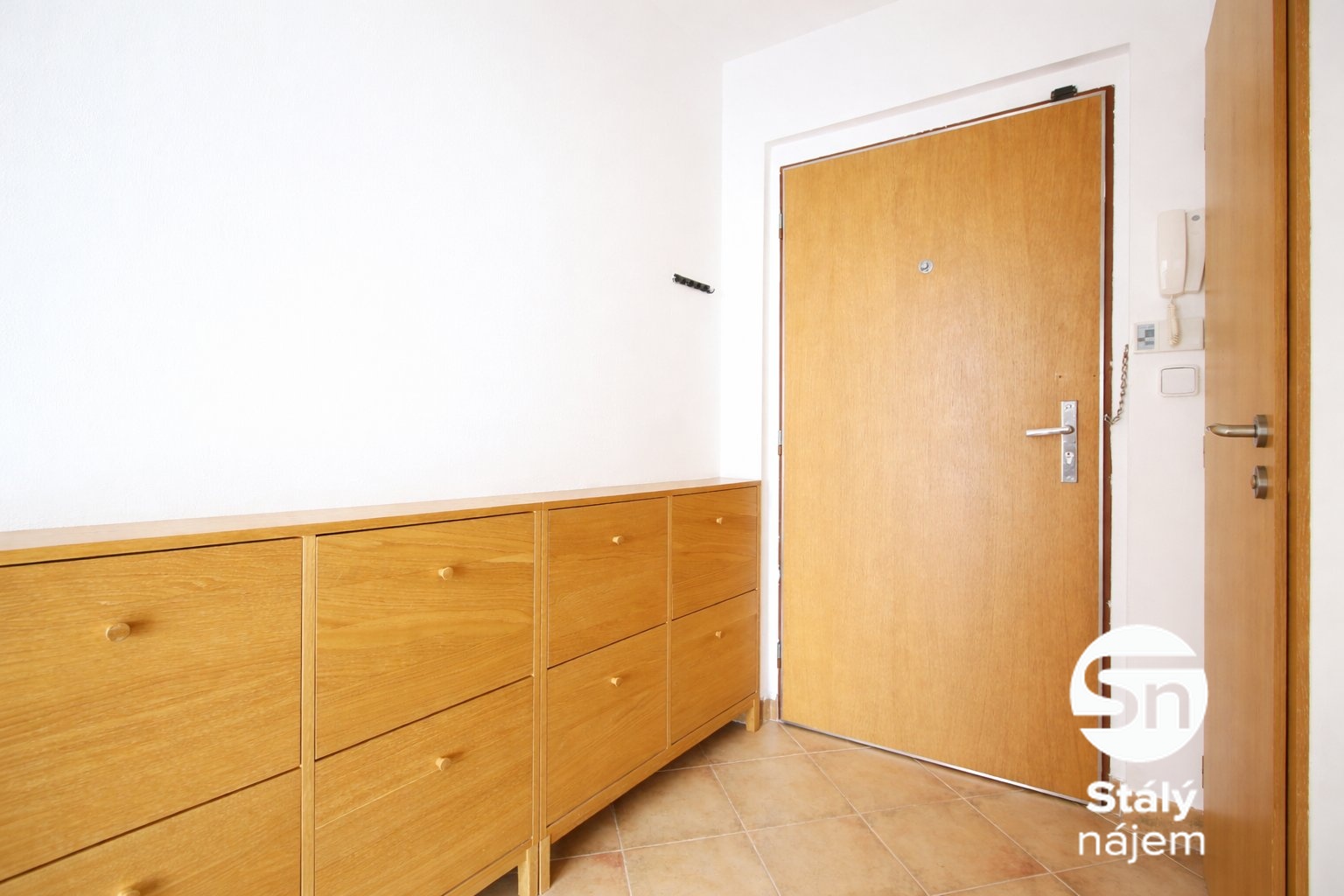Byt je ve velmi dobrém stavu a součástí je praktická kuchyňská linka se spotřebiči, jako je elektrická trouba s varnou deskou a lednice. Obývací prostor disponuje dvěma šatními skříněmi a třemi nástěnnými skříňkami. V předsíni oceníte dva botníky a nástěnný věšák. Koupelna je vybavena sprchovým koutem, umyvadlem s osvětleným zrcadlem, skříňkou a toaletou.
