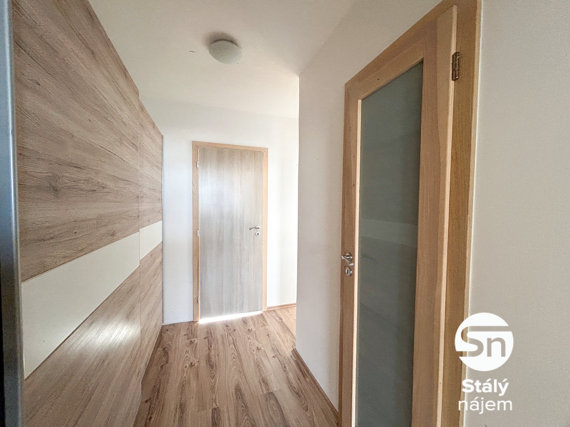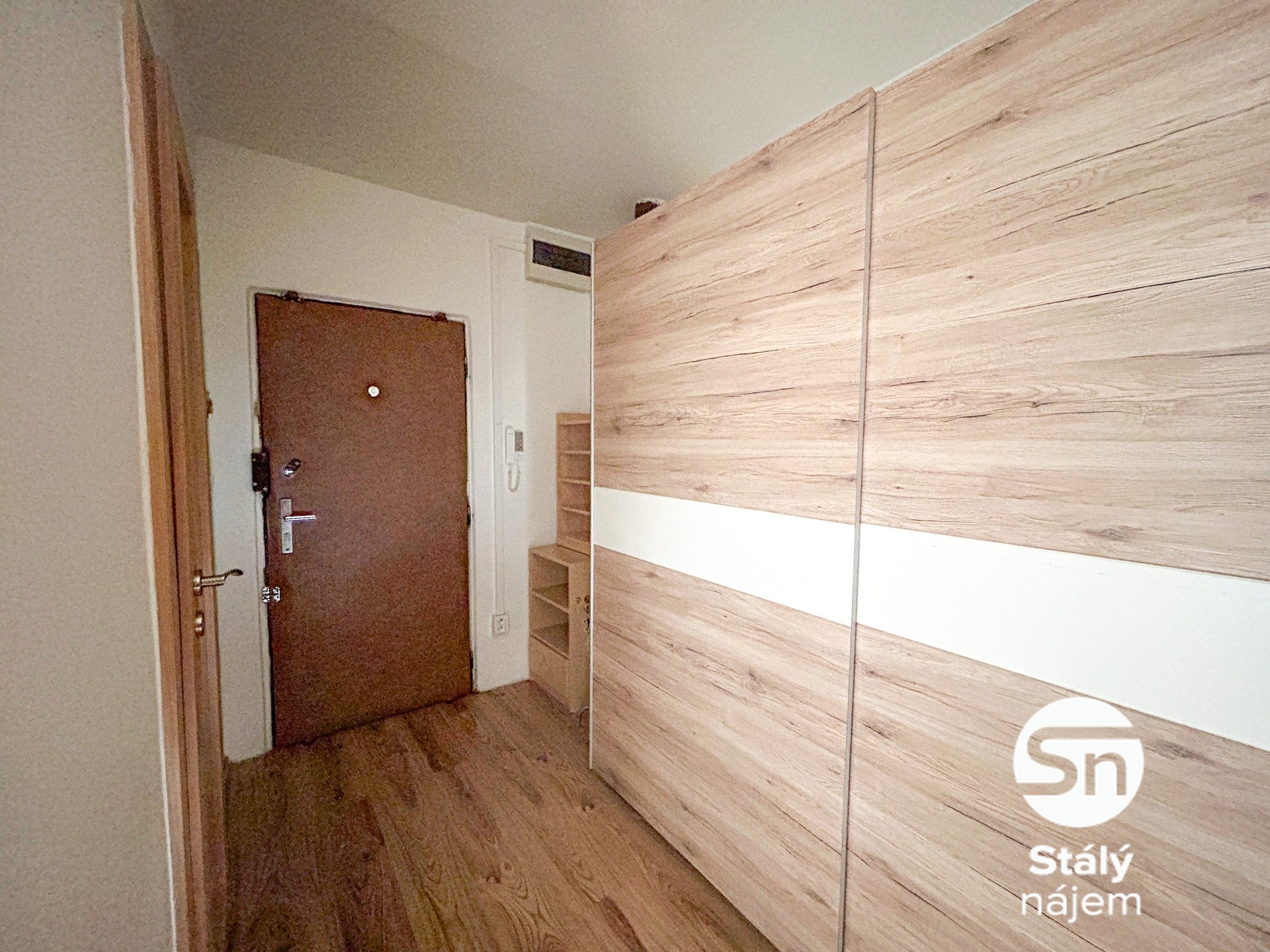Interiér je efektivně rozdělen a částečně vybaven tak, aby vám usnadnil stěhování. V kuchyňském koutě najdete kompletní sadu spotřebičů včetně myčky a mikrovlnné trouby, na které navazuje obývací část s jídelním stolem. Ložnice je vybavena prostornou vestavěnou skříní a rámem postele s úložným prostorem. Nechybí ani dostatek úložných míst v chodbě a moderně řešená koupelna se sprchovým koutem, praktickými skříňkami a pračkou, která je součástí vybavení.