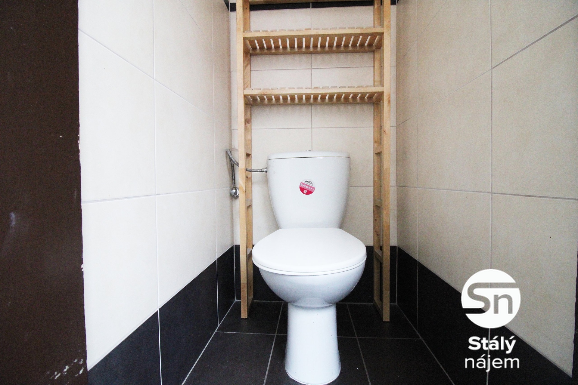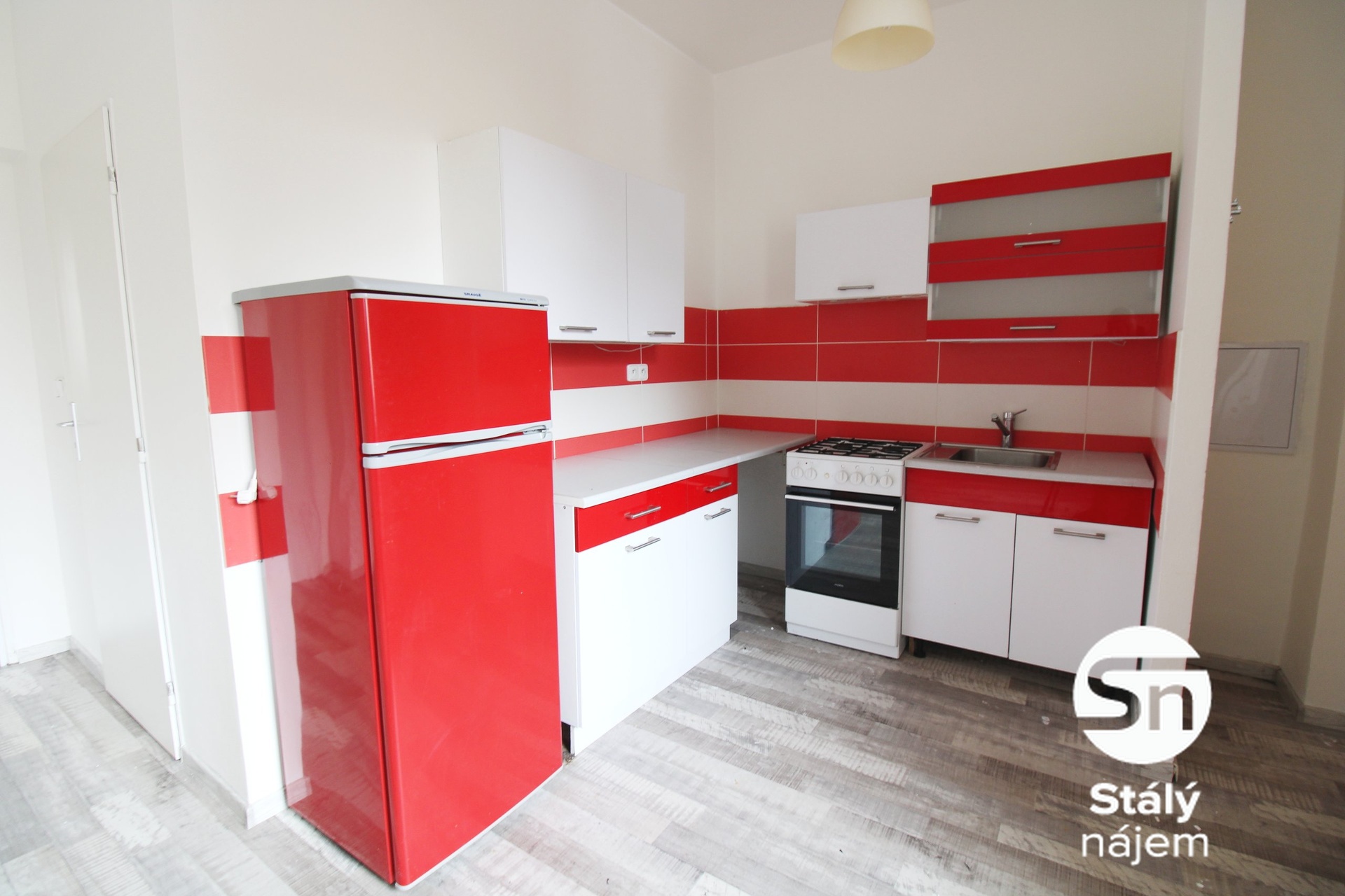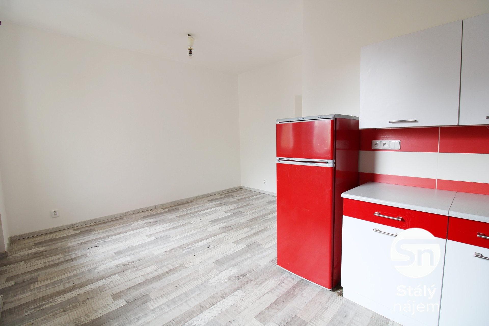 Obývací pokoj je spojený s kuchyňským koutem, který je vybaven kuchyňskou linkou s elektrickou troubou, plynovým sporákem a lednicí s mrazákem. Obývací část je nezařízená, takže si ji můžete zařídit dle vlastních představ. Další pokoj je nezařízený a můžete si z něj vytvořit ložnici či dětský pokoj. Koupelna disponuje sprchovým koutem, pračkou a umyvadlem s úložnými skříňkami. Toaleta je umístěna na pavlači mimo byt.