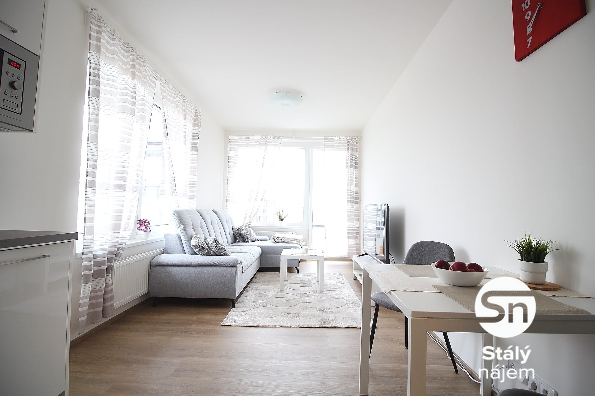 Obývací prostor je elegantně zařízen pohodlnou pohovkou, konferenčním stolkem, televizním stolkem a televizí, což vytváří útulné místo pro relaxaci. Velkým bonusem je přímý vstup na prostornou terasu, která nabízí skvělé možnosti pro venkovní posezení a krásný výhled.