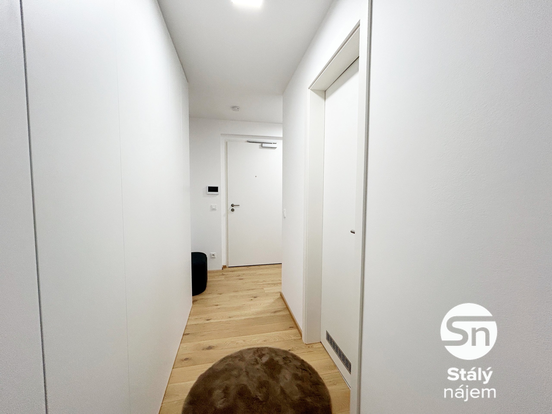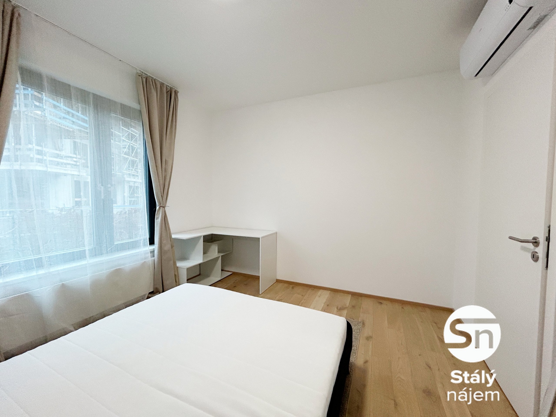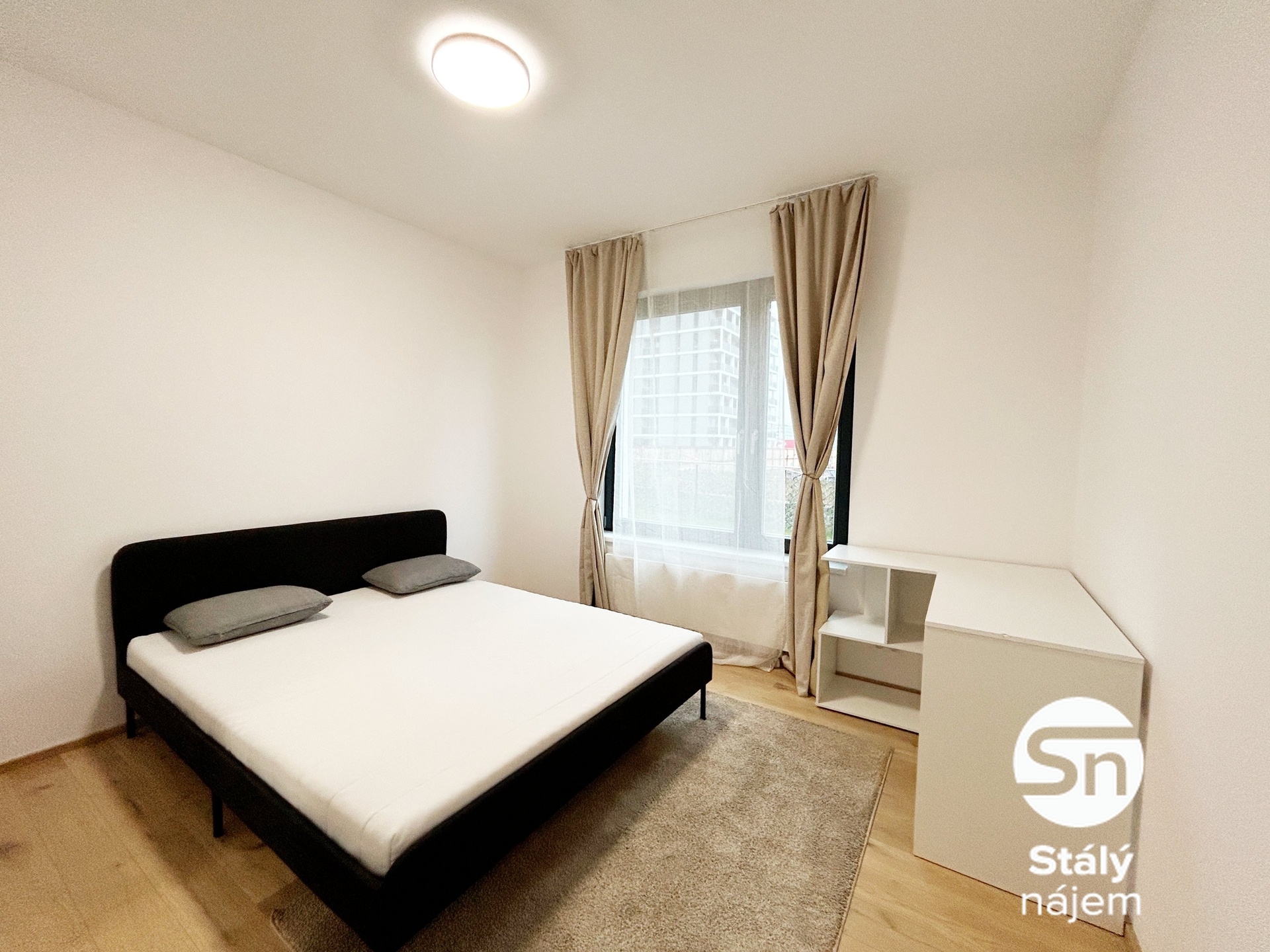 Ložnice je vybavena postelí s matrací, rohovým pracovním stolem, zrcadlem, policemi a klimatizací. V koupelně je vana, pračka, skříňka nad umyvadlem a toaleta. Chodba má vestavěné skříně, botník, věšáky a dostatek úložného prostoru. K bytu navíc náleží sklepní kóje, ideální například na sezonní věci či sportovní vybavení.