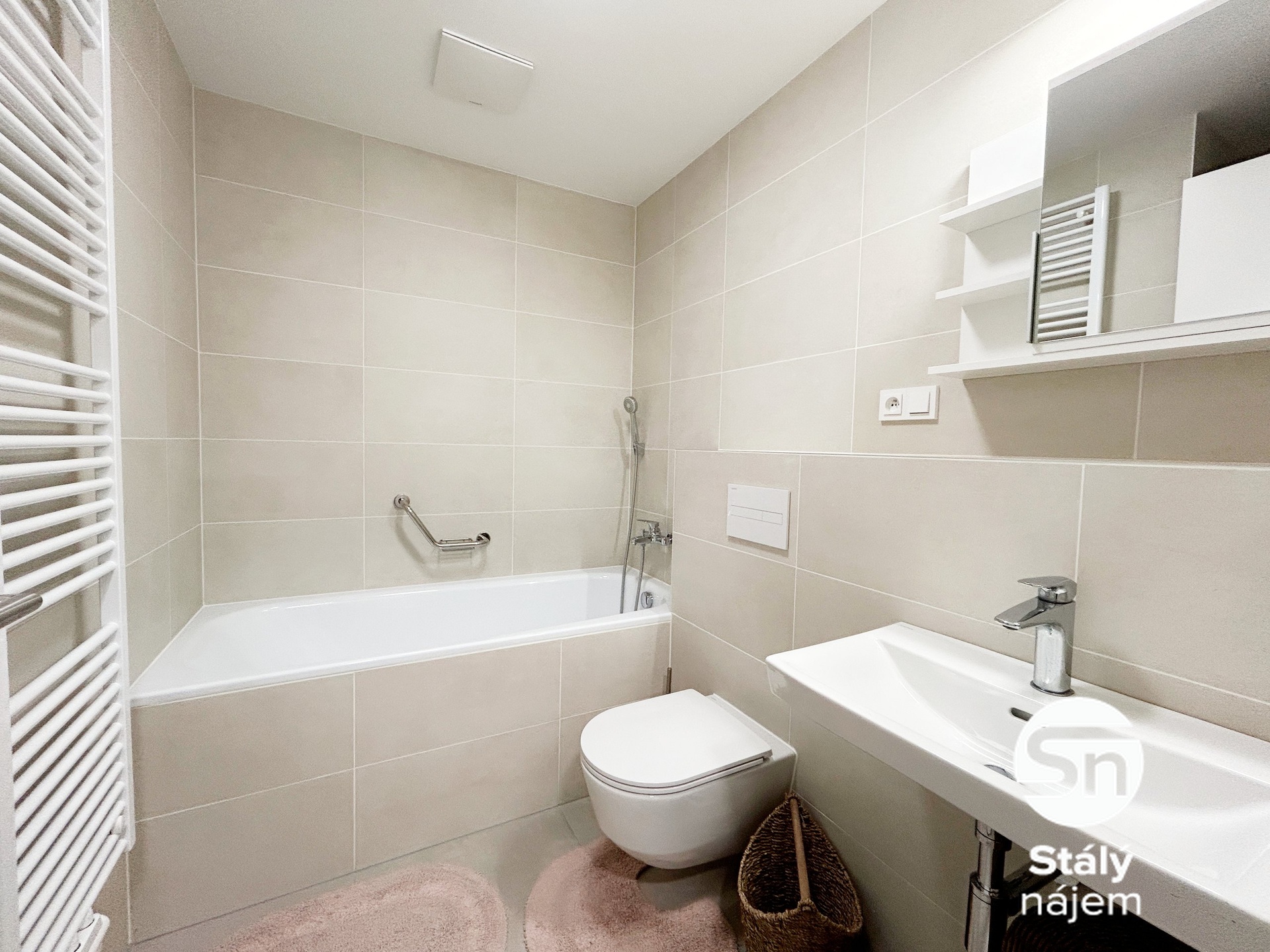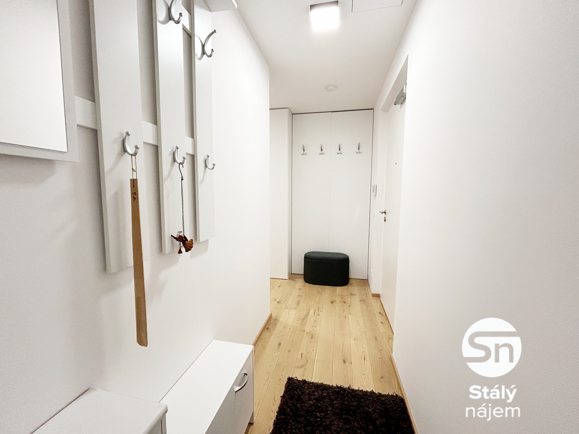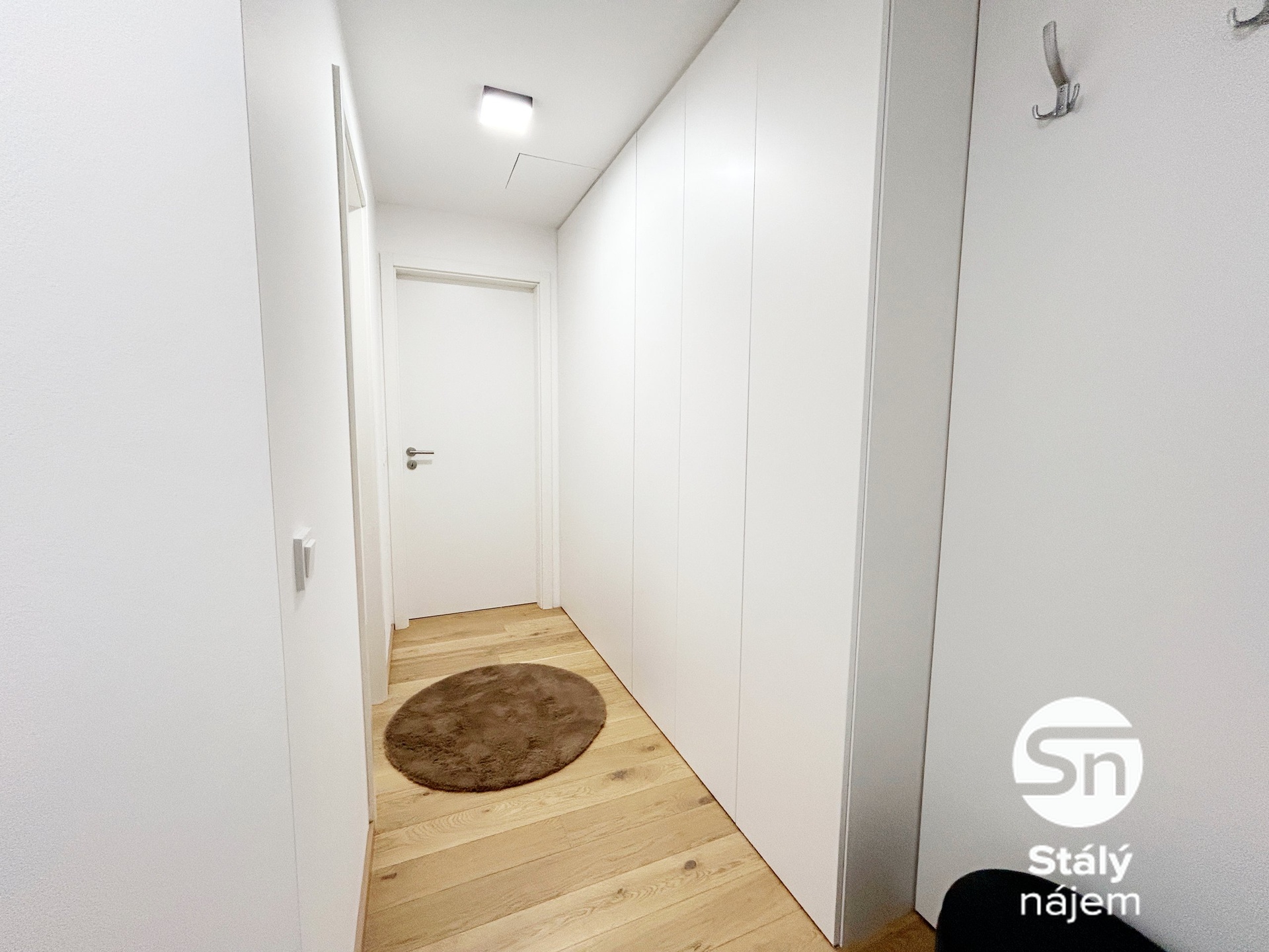 Ložnice je vybavena postelí s matrací, rohovým pracovním stolem, zrcadlem, policemi a klimatizací. V koupelně je vana, pračka, skříňka nad umyvadlem a toaleta. Chodba má vestavěné skříně, botník, věšáky a dostatek úložného prostoru. K bytu navíc náleží sklepní kóje, ideální například na sezonní věci či sportovní vybavení.