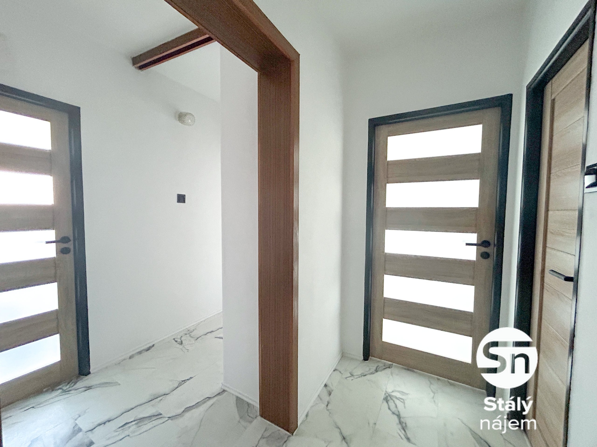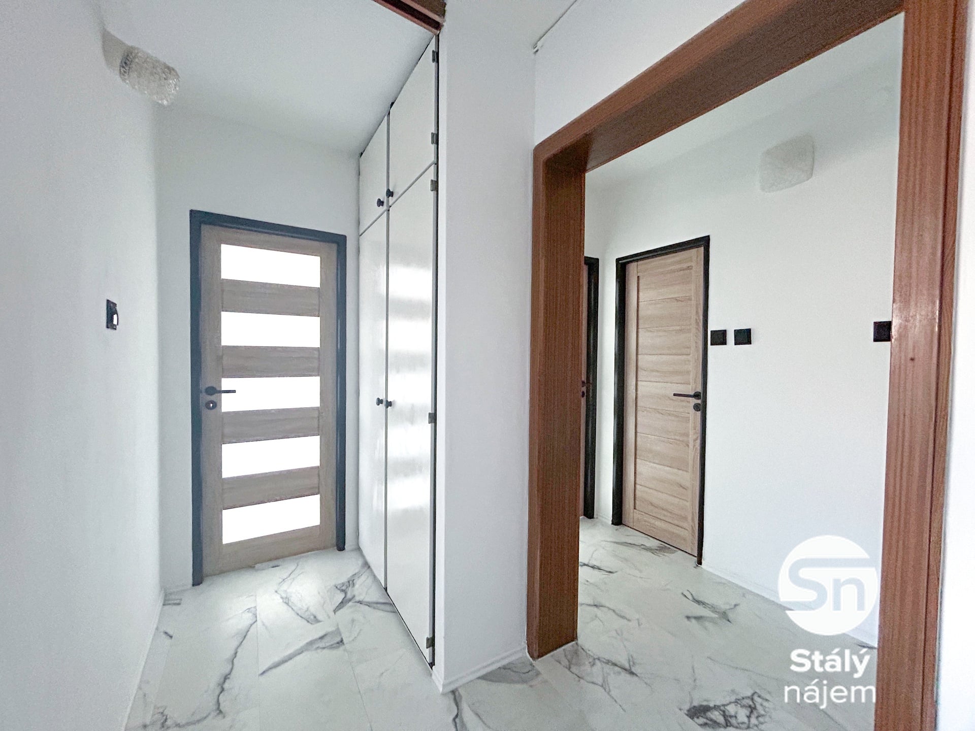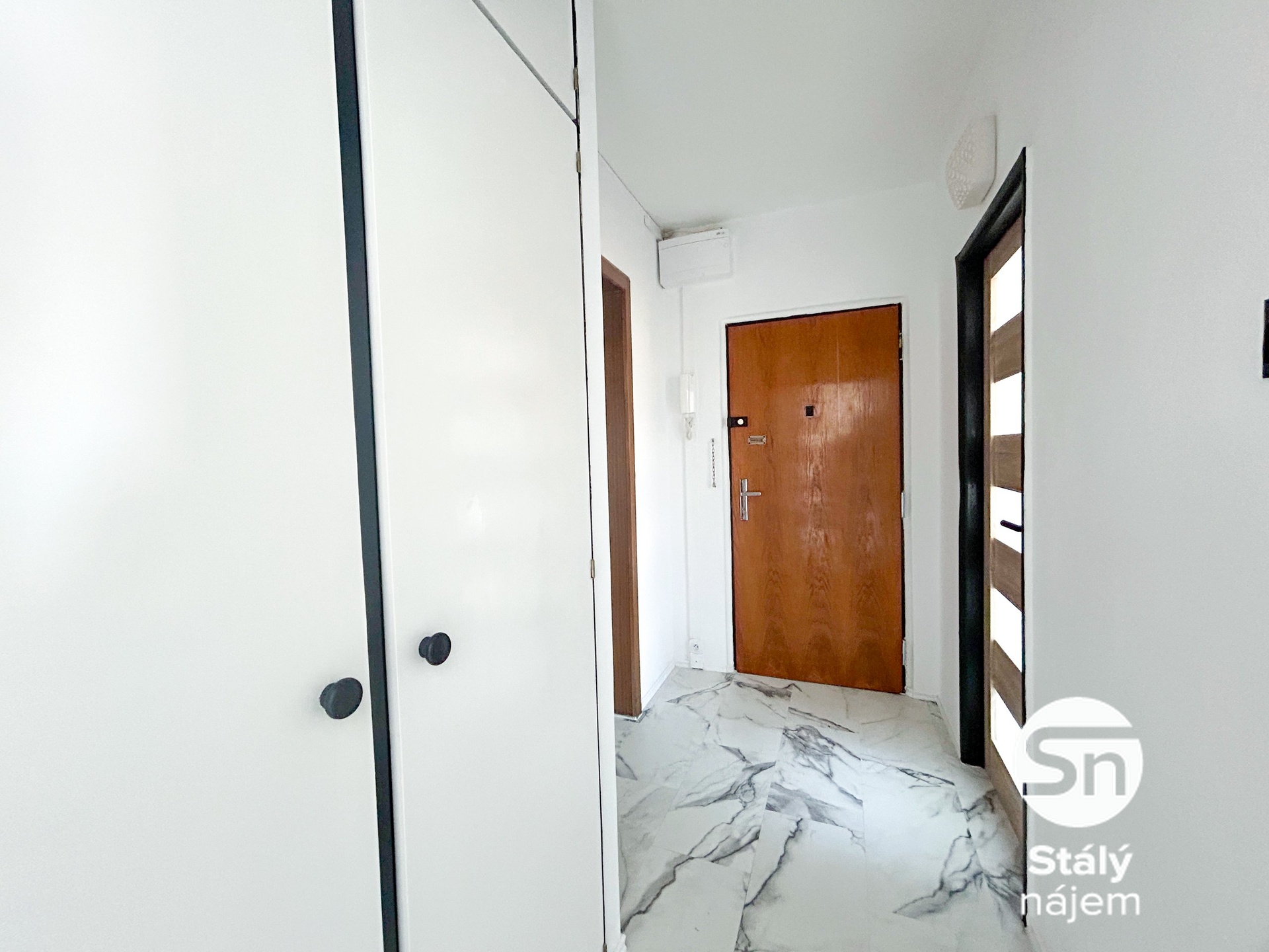 Interiér je prakticky řešen a částečně vybaven tak, aby vám usnadnil stěhování. V chodbě najdete prostornou vestavěnou skříň, v kuchyni je pak připravena linka s plynovým sporákem, elektrickou troubou a dalšími vestavěnými skříněmi. Okna v pokojích jsou osazena textilními roletami, přičemž v kuchyni oceníte venkovní elektrickou roletu pro dokonalé zastínění. Moderní koupelna disponuje sprchovým koutem a kompletním úložným systémem včetně zrcadlové skříňky s osvětlením. Obývací pokoj, ze kterého se vstupuje na lodžii, je vybaven textilními žaluziemi.