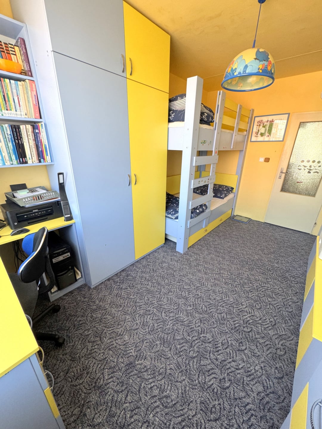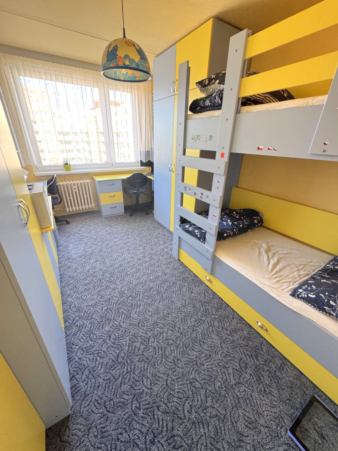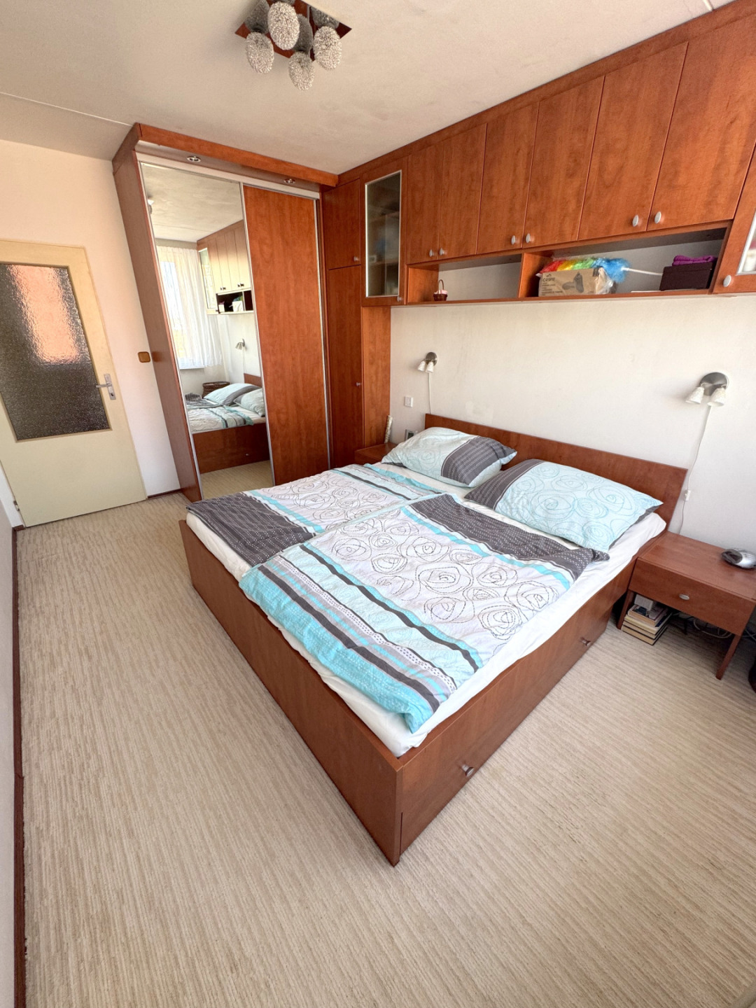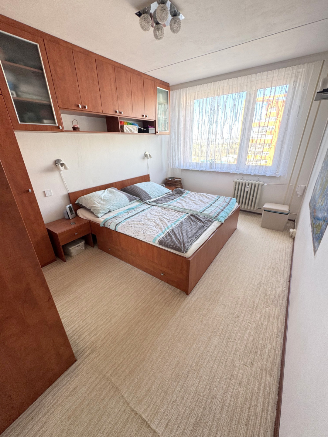 Byt je ve výborném stavu a disponuje se vstupní chodbou vybavenou vestavěnou skříní a botníkem, dětským pokojem vybaveným kompletním nábytkem vč. palandy (lze po dohodě vystěhovat), ložnicí vybavenou nábytkem na míru vč. manželské postele, obývacím pokojem, který zůstává bez nábytku, kuchyňským koutem vybaveným kuchyňskou linkou se spotřebiči (sklokeramická deska, ele.trouba, lze dodat myčku a lednici). Z obývacího pokoje je vstup na zasklenou lodžii. Koupelna s vanou, WC samostatné.