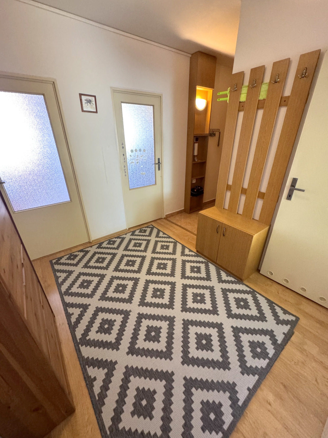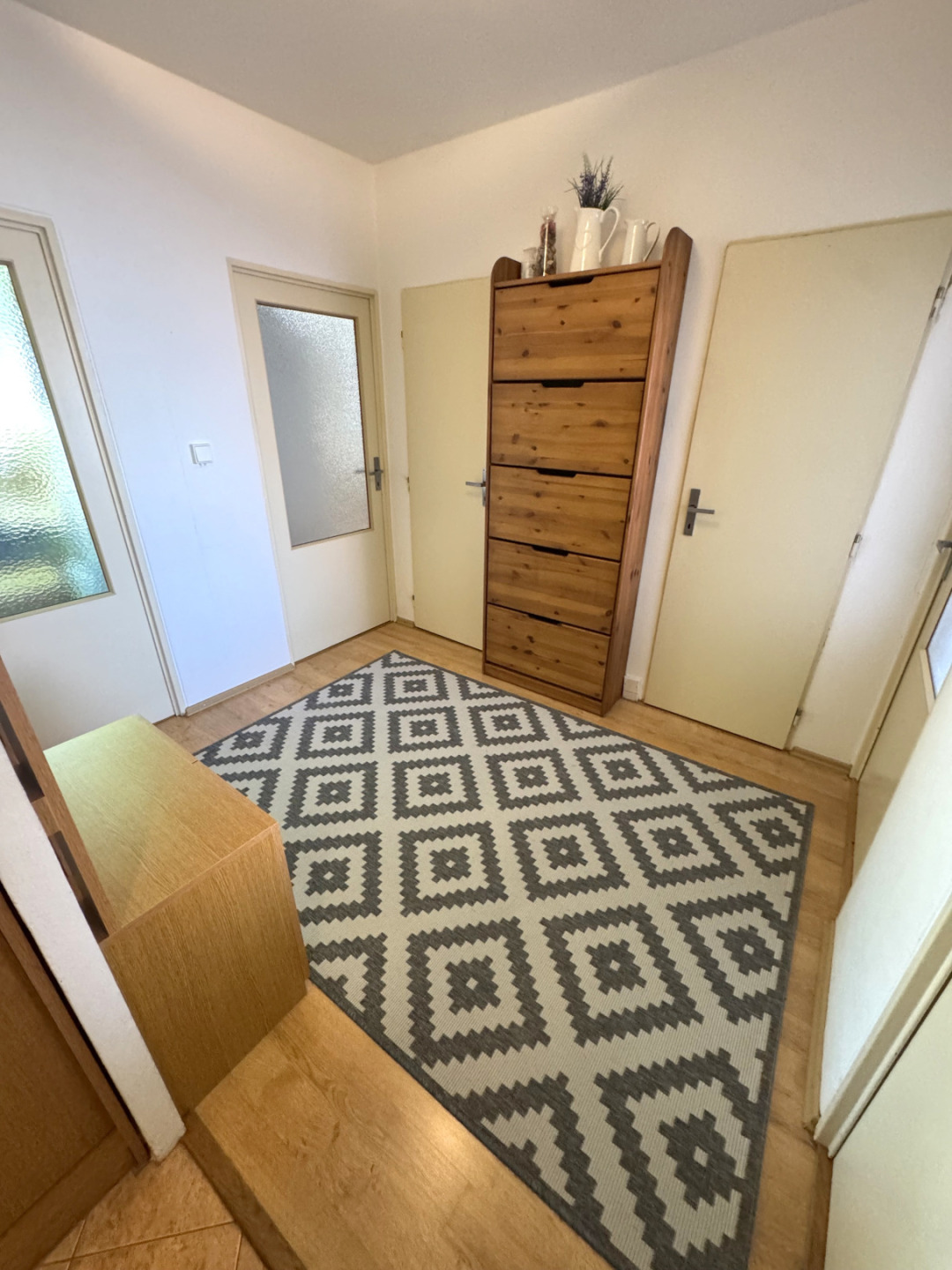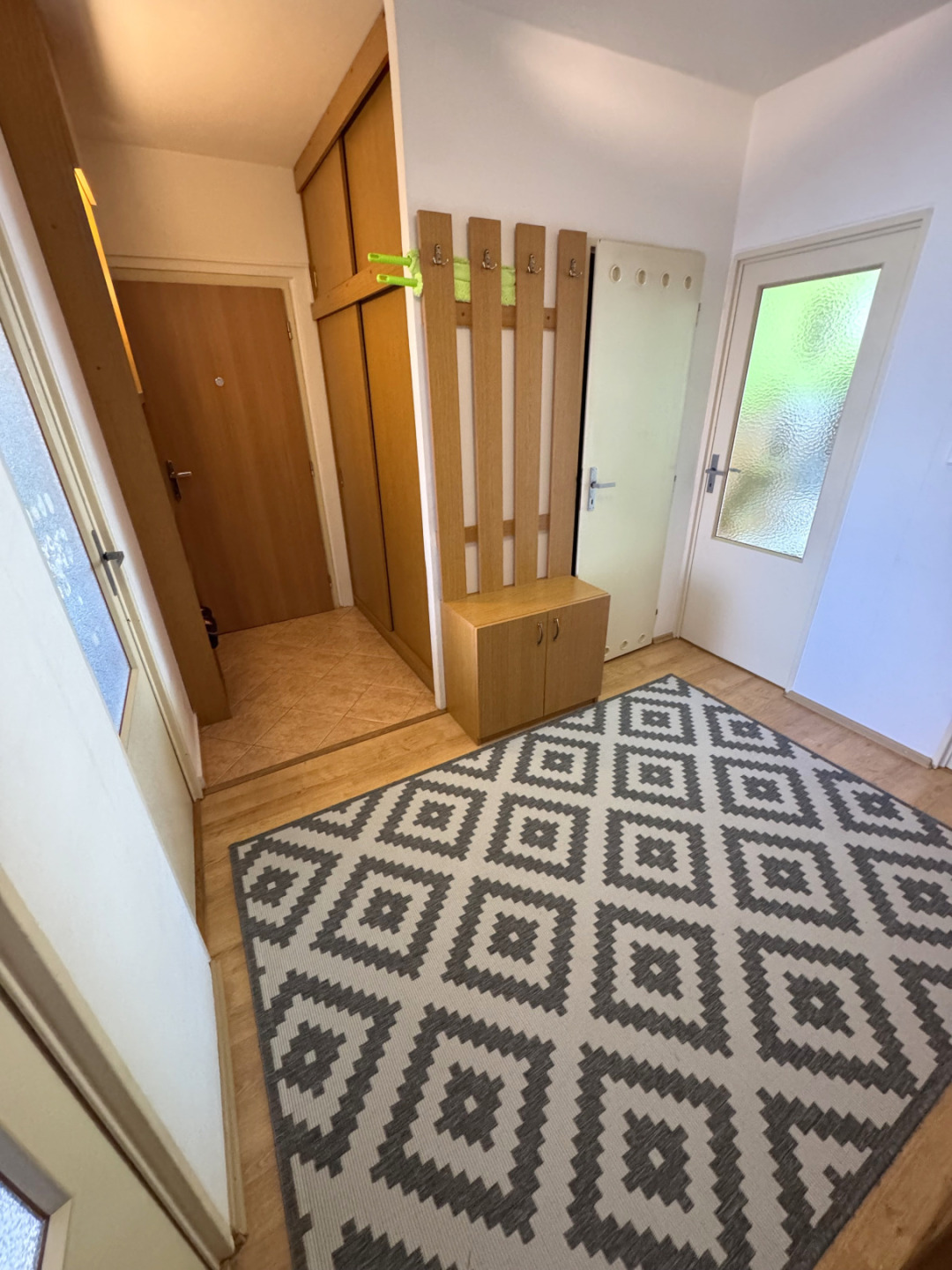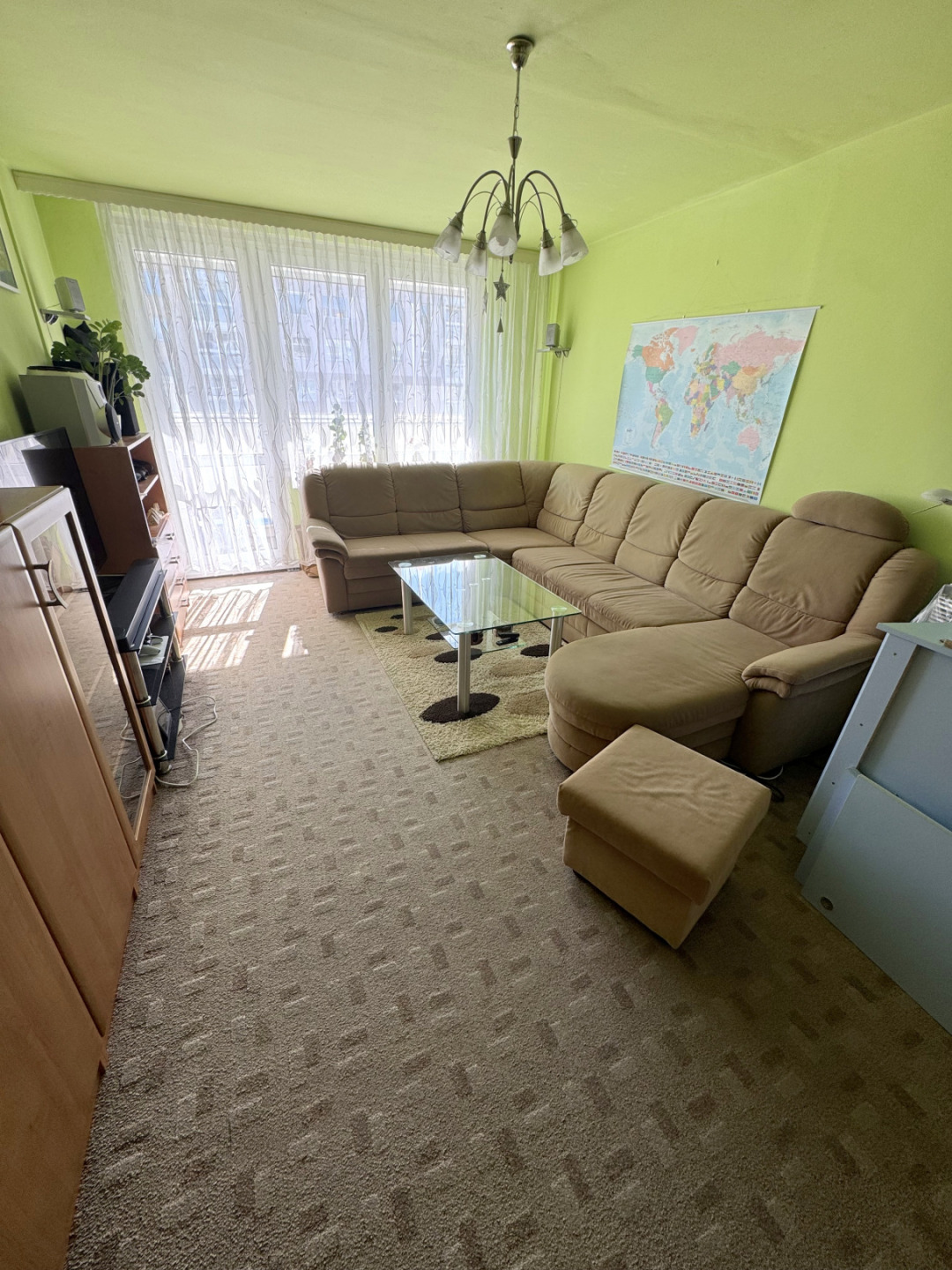 Byt je ve výborném stavu a disponuje se vstupní chodbou vybavenou vestavěnou skříní a botníkem, dětským pokojem vybaveným kompletním nábytkem vč. palandy (lze po dohodě vystěhovat), ložnicí vybavenou nábytkem na míru vč. manželské postele, obývacím pokojem, který zůstává bez nábytku, kuchyňským koutem vybaveným kuchyňskou linkou se spotřebiči (sklokeramická deska, ele.trouba, lze dodat myčku a lednici). Z obývacího pokoje je vstup na zasklenou lodžii. Koupelna s vanou, WC samostatné.