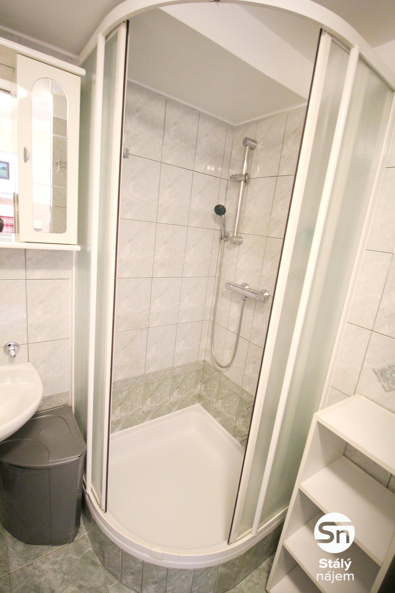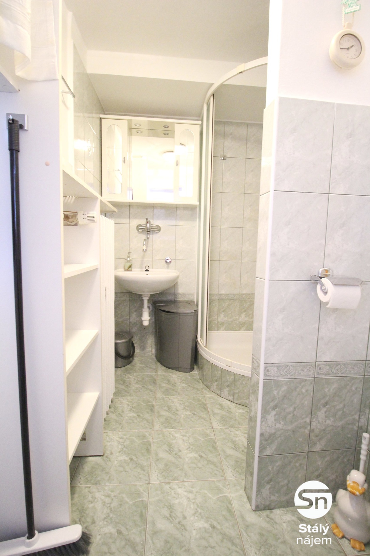 Koupelna je zařízena sprchovým koutem, umyvadlem a toaletou. V předsíni je dostatek úložného prostoru díky velké skříni a botníku. Vybavení bytu uvedené na fotografiích, nemusí odpovídat skutečnému stavu bytu.