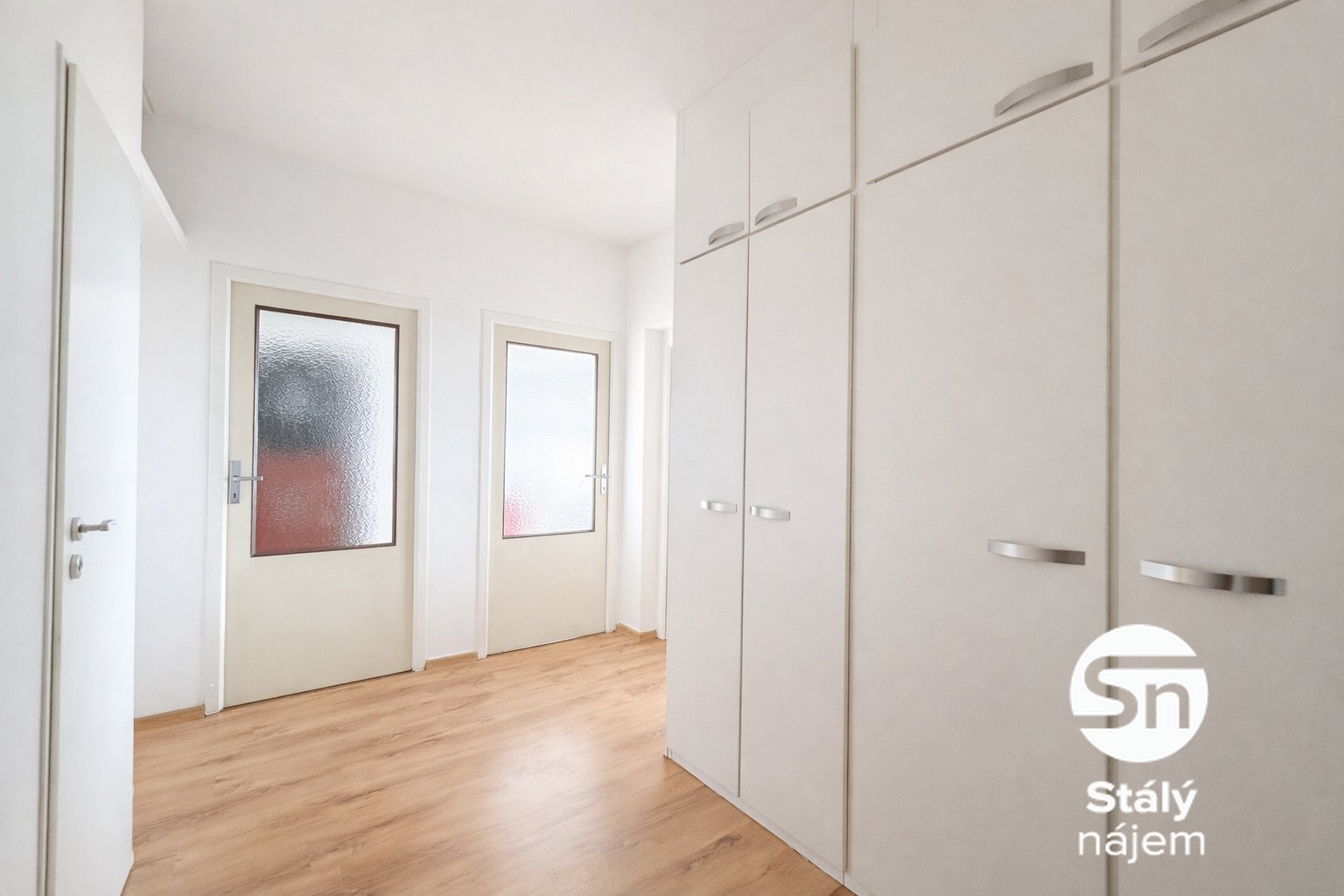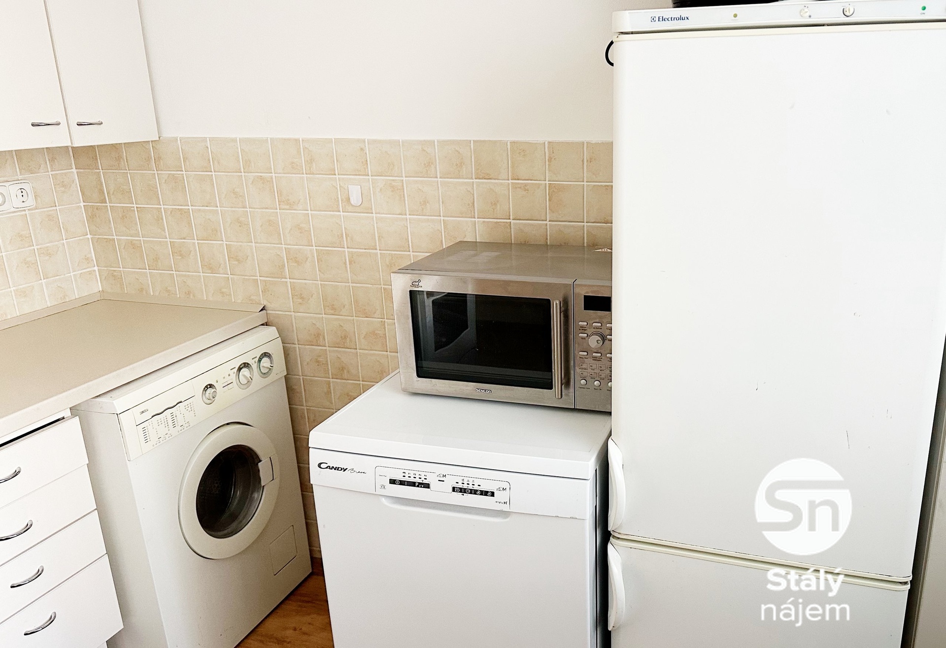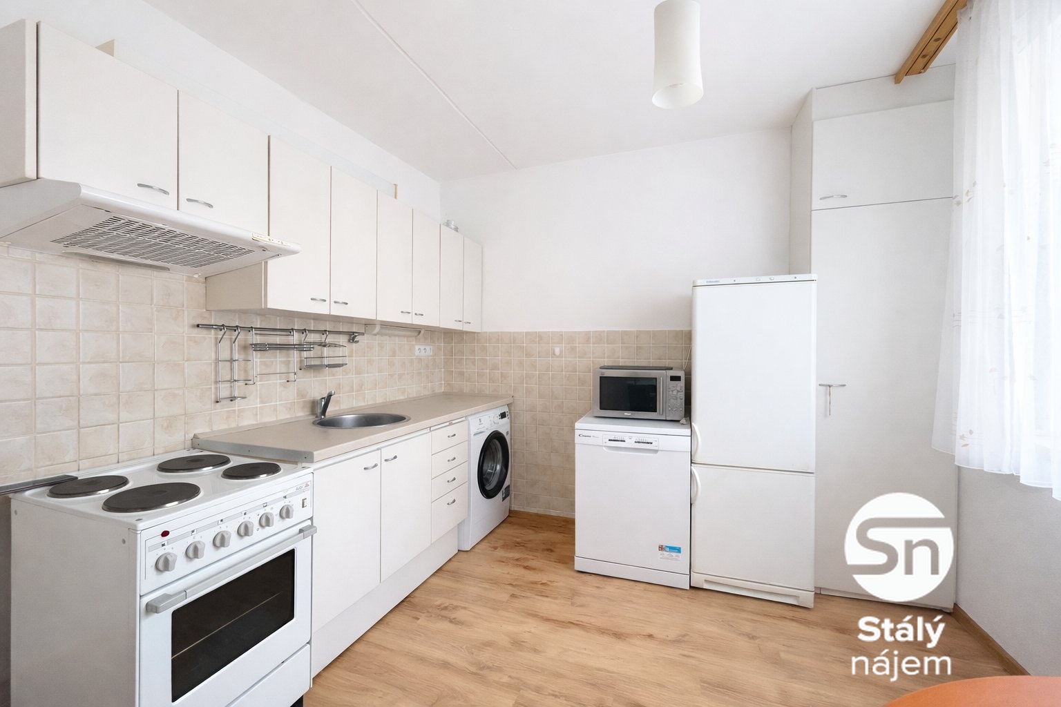 Z chodby bytu se dostanete do kuchyně, která disponuje kuchyňskou linkou s lednicí, sporákem, troubou, myčkou a pračkou. Dále se z chodby dostanete do obývacího pokoje, který je vybaven TV stěnou, a do dalších dvou samostatných pokojů. Z chodby je také vstup do koupelny s vanou a na samostatné WC.
