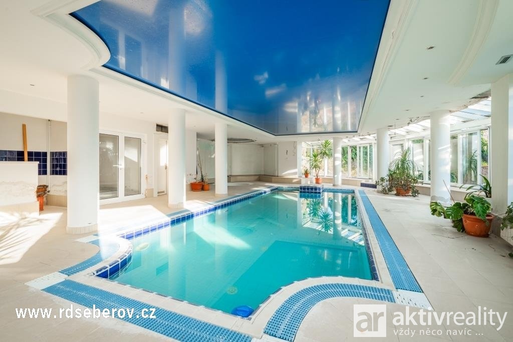 Suterén (343 m²): Využijte jej jako firemní wellness, privátní fitness, rehabilitační centrum nebo relaxační zónu. Zahrnuje velký bazén (10 x 4 m) s protiproudem, vířivku pro 6 osob, sprchový kout a technické zázemí (kotelna, vzduchotechnika).