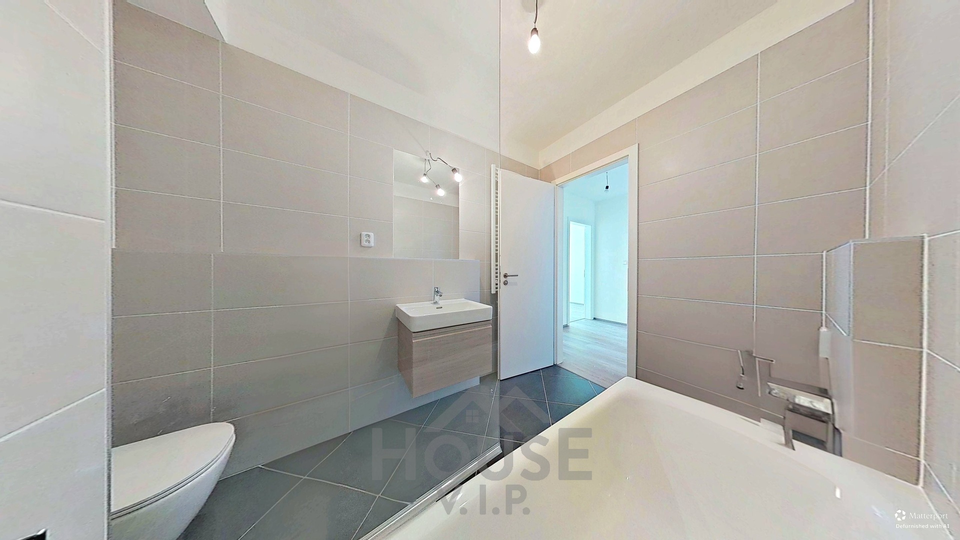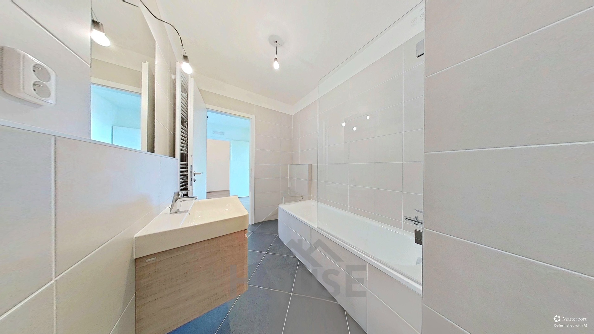 Byt je dokončen ve standardu zahrnujícím interiérové dveře, položené podlahy a koupelnu v nadstandardním provedení značky Laufen.