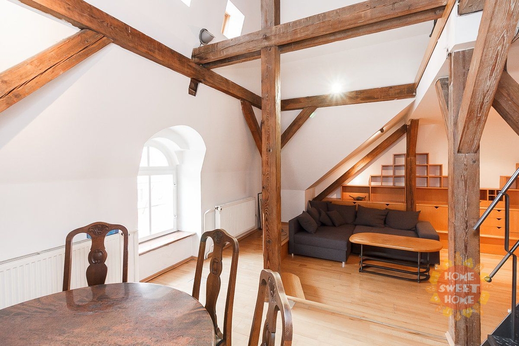 Zařízený mezonetový byt s mnoha původními prvky v atraktivní lokalitě Starého Města s okouzlujícím výhledem až na Pražský hrad. Celková výměra bytu je 120 m2. Byt se nachází v pátém patře historického domu bez výtahu. Byt 3+1 je je zcela zařízený. Byt je složen z jednoho menšího pokoje, jednoho velkého pokoje s manželskou postelí v otevřeném podkrovním patře, kuchyně a dvou koupelen a je zcela zařízený včetně vestavěné skříně, s dřevěnou podlahou a dlažbou. Kuchyň je vybavena elektrickými spotřebiči. Součástí bytu je pokoj pro hosty s vlastní koupelnou se sprchovým koutem. V jedné ze dvou koupelen je masážní vana. Dům je zabezpečen a napojen na bezpečnostní pult. Ideální umístění v centru Prahy, stanice metra Můstek je vzdálena 2. minuty chůze od domu.