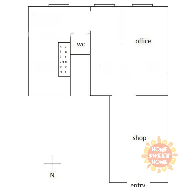 Dispozice se skládá z prodejního prostoru, samostatné kanceláře, místnosti s kuchyňskou linkou a toalety. Vytápění je zajištěno prostřednictvím plynového kotle. Na podlahách jsou plovoucí podlahy.