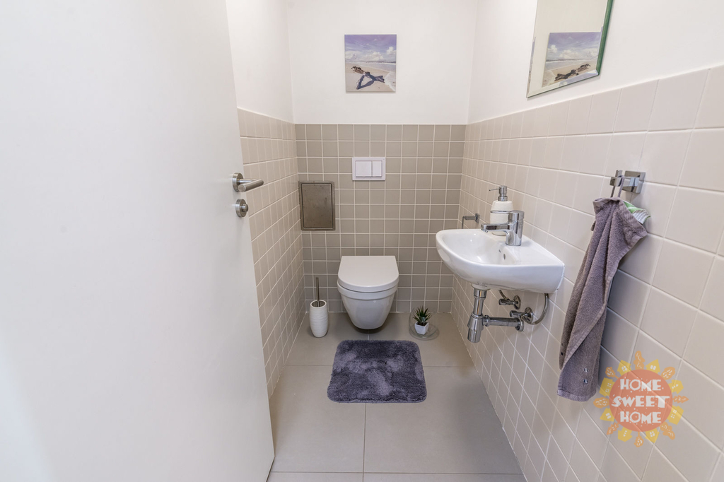 Byt sestává ze vstupní chodby (15,20m2), obývacího pokoje s kuchyňským koutem (28,70m2) a vstupem na balkón (5m2), ze kterého je krásný výhled do přilehlého parku. Kuchyň je vybavena moderními spotřebiči, včetně sklokeramické varné desky, elektrické trouby, mikrovlnné trouby, myčky, kombinované lednice, kávovaru a digestoře. Dále je zde ložnice (12,20m2) s vlastní koupelnou se sprchovým koutem a WC (3,40m2), dětský pokoj/pracovna (10,90m2) druhá velká koupelna (6,20m2) a samostatné WC (2,20m2).