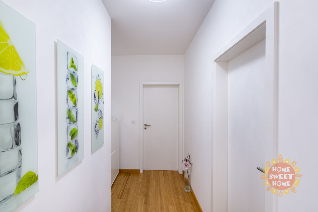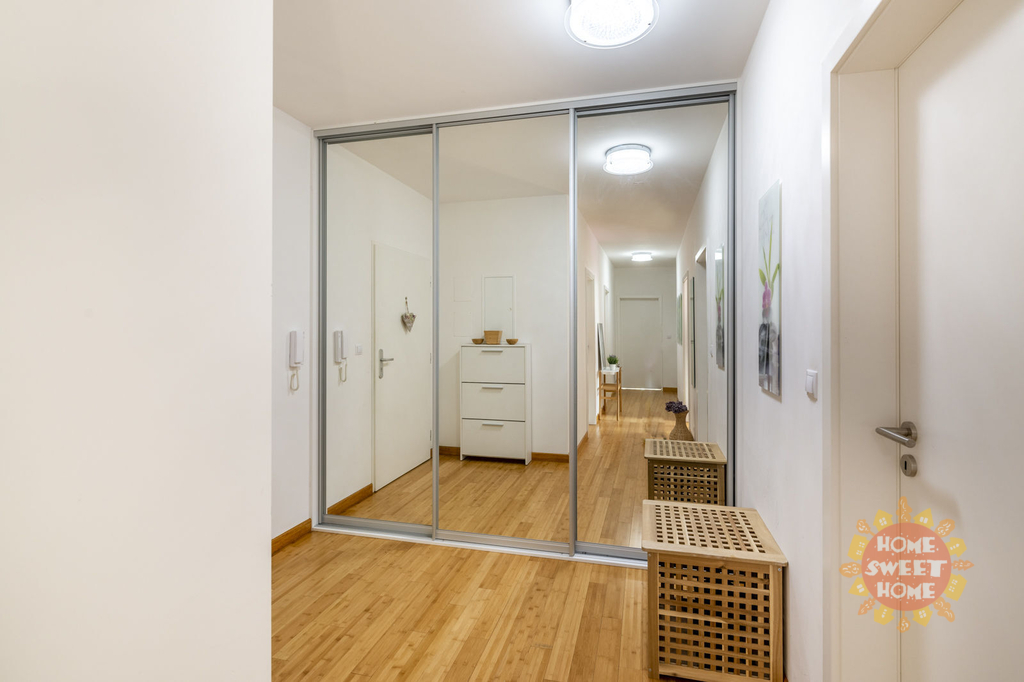 Díky orientaci bytu na východ, jih a západ je byt prosluněný v průběhu celého dne. Samozřejmostí je bezproblémové připojení vysokorychlostního internetu. Byt je vybaven centrálním vytápěním, což zajišťuje příjemnou atmosféru po celý rok. Dlažba a podlaha z dřevobambusu dodávají interiéru moderní přírodní charakter. Podzemní garážové stání, sklep (3,30m2) a vybavení bytu je součástí kupní ceny.