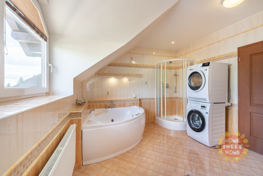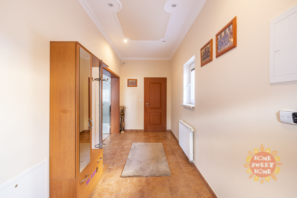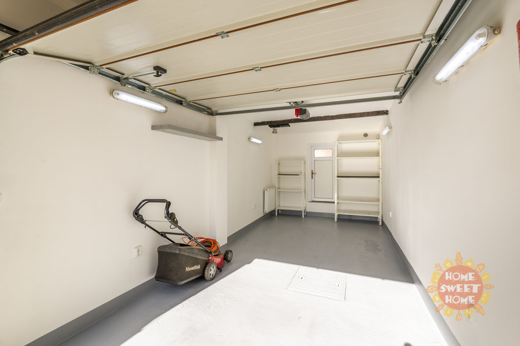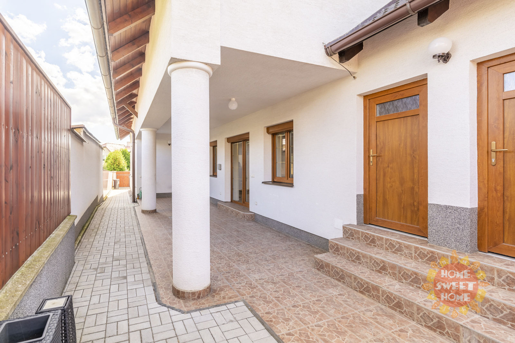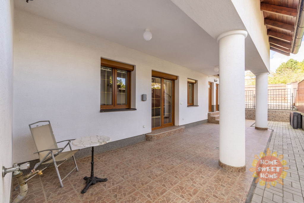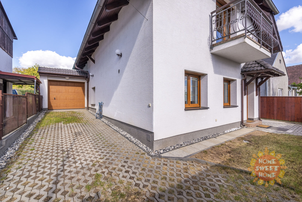 Dům sestává z moderní kompletně vybavené kuchyně (lednička s mrazničkou, trouba, mikrovlnka, sklokeramická varná deska, myčka) propojené s obývacím pokojem, 3 oddělených ložnic, koupelny s vanou, sprchovým koutem a toaletou, samostatného WC. Na podlahách je plovoucí podlaha a v koupelnách dlažba, která je vyhřívaná. Lze u domu zaparkovat 3 auta - 1 garážové stání, 2 stání ve dvoře. Objekt je střežen kamerami a je zde i zabezpečovací systém. Zahrada je automaticky zavlažována a je zde k dispozici i venkovní krb.