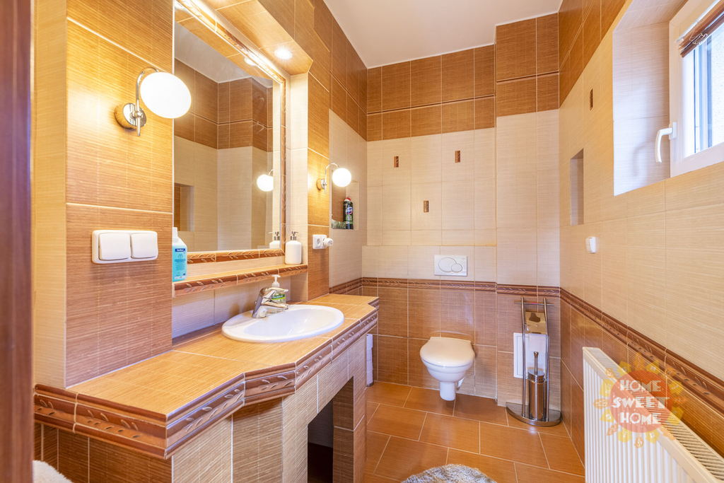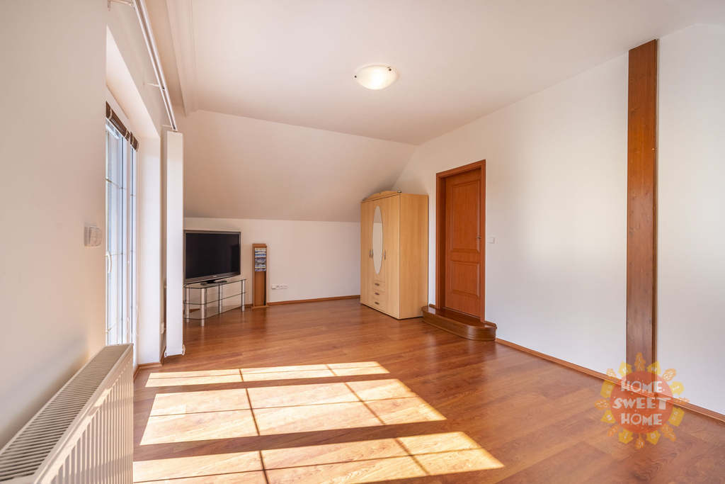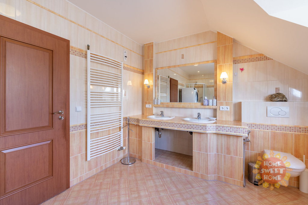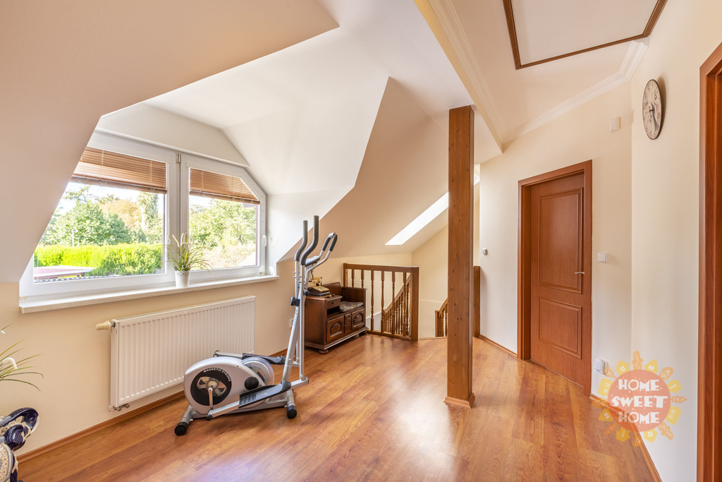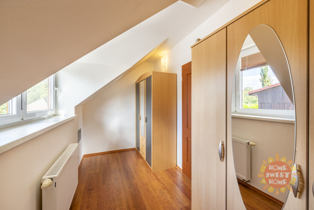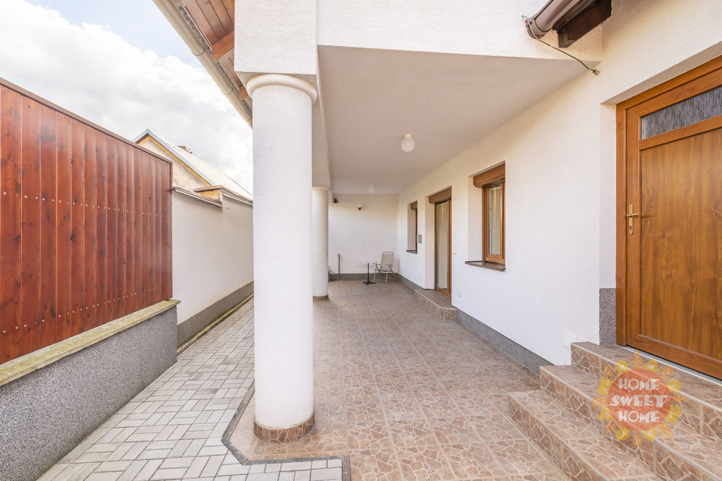 Dům sestává z moderní kompletně vybavené kuchyně (lednička s mrazničkou, trouba, mikrovlnka, sklokeramická varná deska, myčka) propojené s obývacím pokojem, 3 oddělených ložnic, koupelny s vanou, sprchovým koutem a toaletou, samostatného WC. Na podlahách je plovoucí podlaha a v koupelnách dlažba, která je vyhřívaná. Lze u domu zaparkovat 3 auta - 1 garážové stání, 2 stání ve dvoře. Objekt je střežen kamerami a je zde i zabezpečovací systém. Zahrada je automaticky zavlažována a je zde k dispozici i venkovní krb.