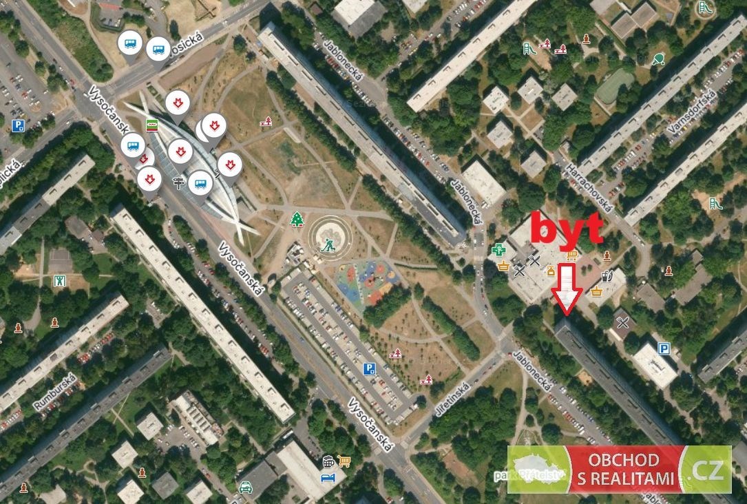 Bytová jednotka se nachází na adrese Jablonecká 420/66, 190 00 Praha 9 (Střížkov). Přes ulici se nachází park Přátelství (mimo jiné se jedná o park s nejdelší umělou vodní soustavou v Praze), 330 metrů od domu vstup do metra trasy C Střížkov. Při jednom konci panelového domu se nachází Penny market, při opačném konci domu se nachází Billa, vše je tedy v pěší dostupnosti!