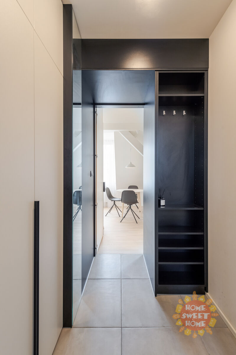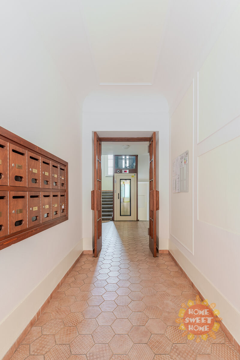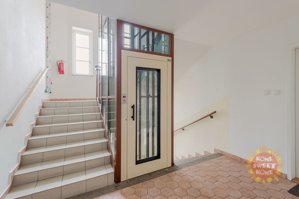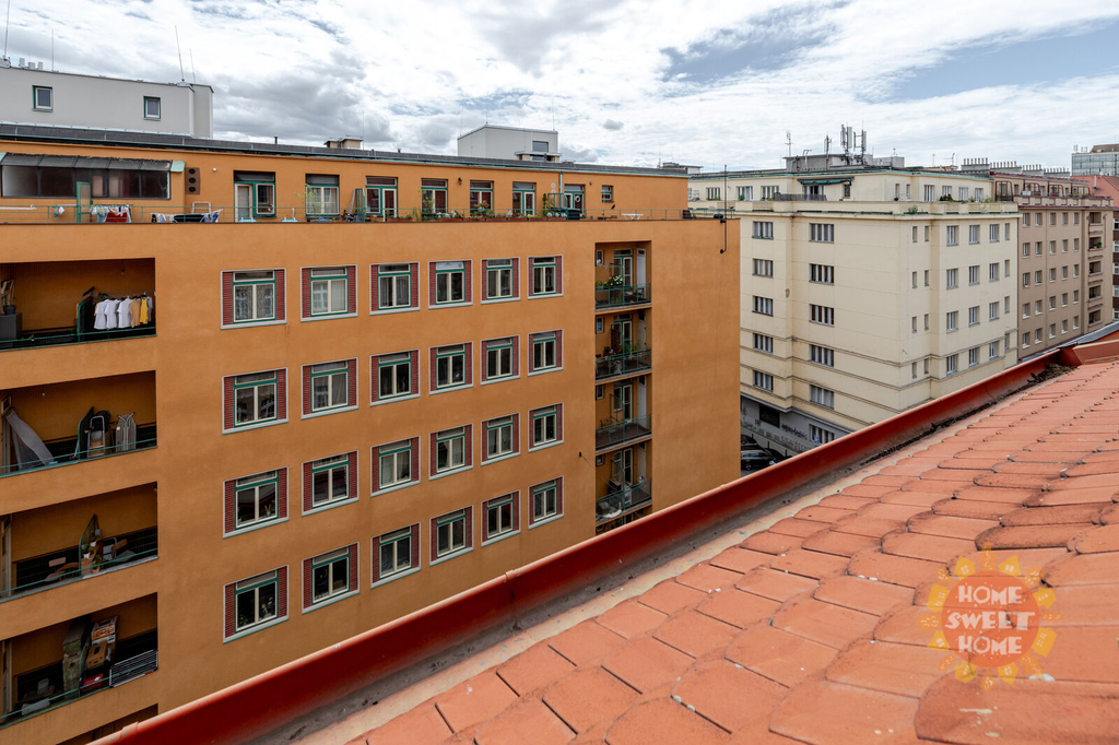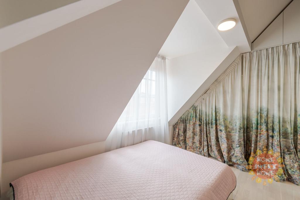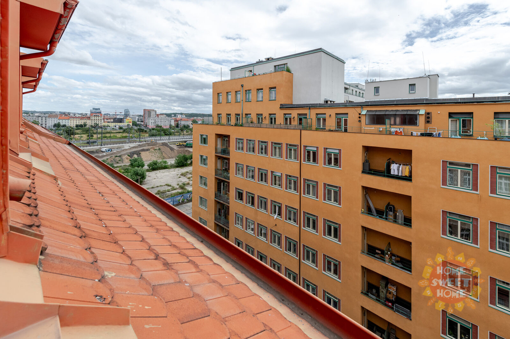 V bytě bylo využito každé místo k úložným prostorům na míru, vysoké stropy v kombinaci se třemi velkými dvojitými okny zajišťují dostatek světla, a klidu. Byli zde použity kvalitní materiály, dřevěné podlahy a dřevěná okna, vytápění vlastním elektrickým kotlem.