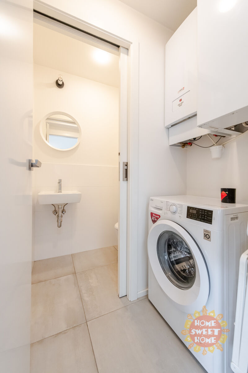 vstupní chodba s úložnými prostory, obývací pokoj s jídelním prostorem, místem na pracovnu a s kuchyňským koutem vybaveným všemi spotřebiči – sklokeramická deska, lednice, myčka, horkovzdušná trouba, ložnice se skleněnou stěnou, koupelna se sprchovým koutem, samostatná toaleta a komora s pračkou.