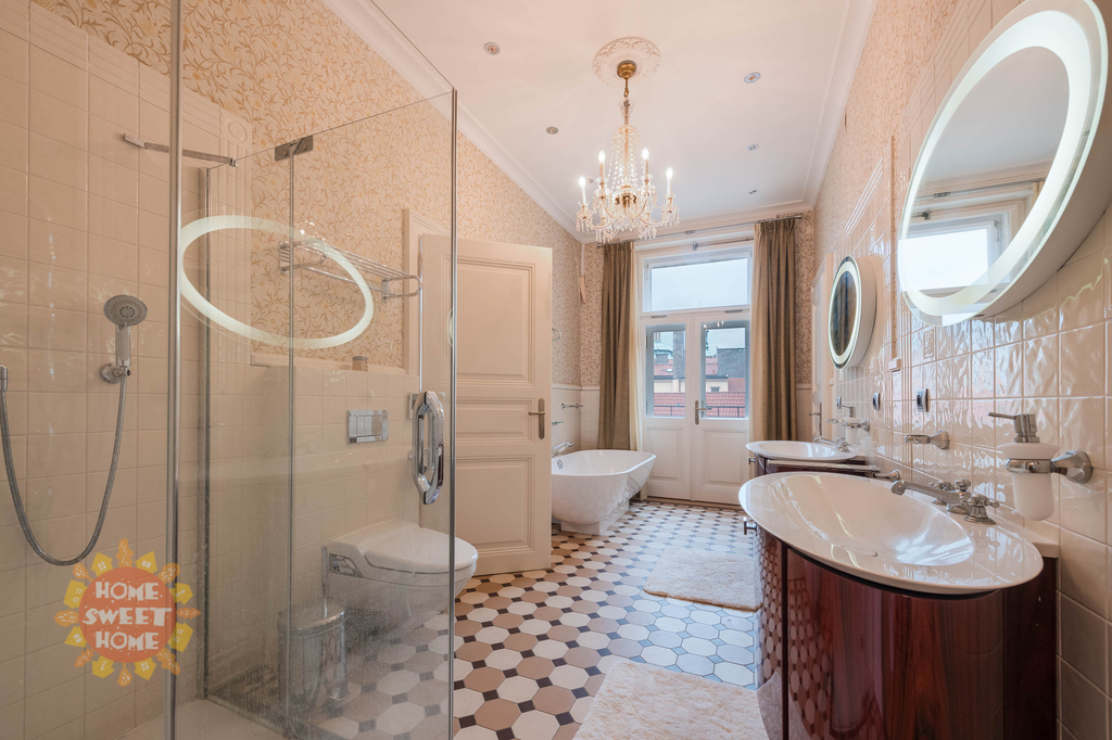 Jedinečné prvky secesního bytu navazují příjemnou atmosféru : vysoké stropy, štuky, masivní parkety, repasovaná kachlová kamna, designová původní svítidla. V bytě jsou bezpečnostní vstupní dveře, pračka, sušička, internet, alarm, videotelefon, bezpečnostní kamery.