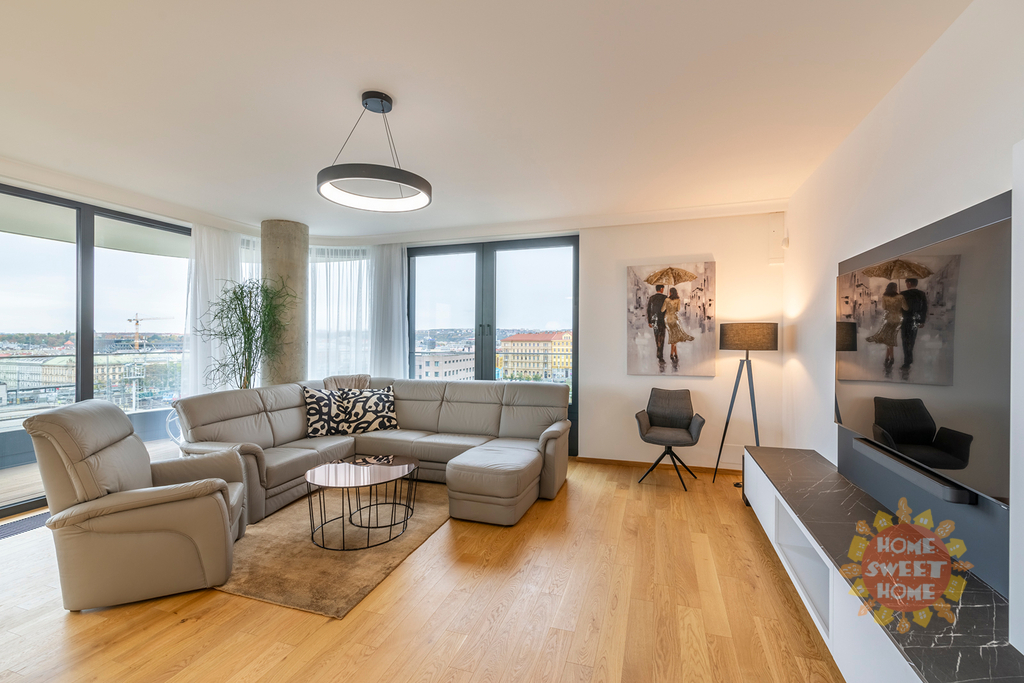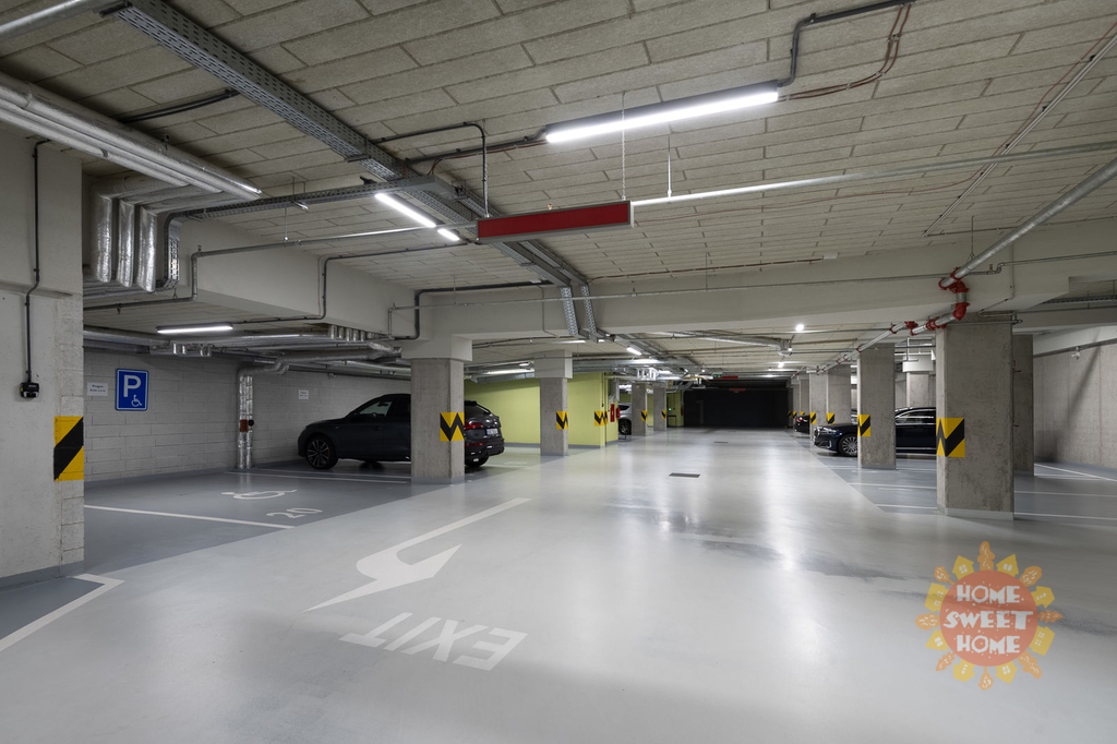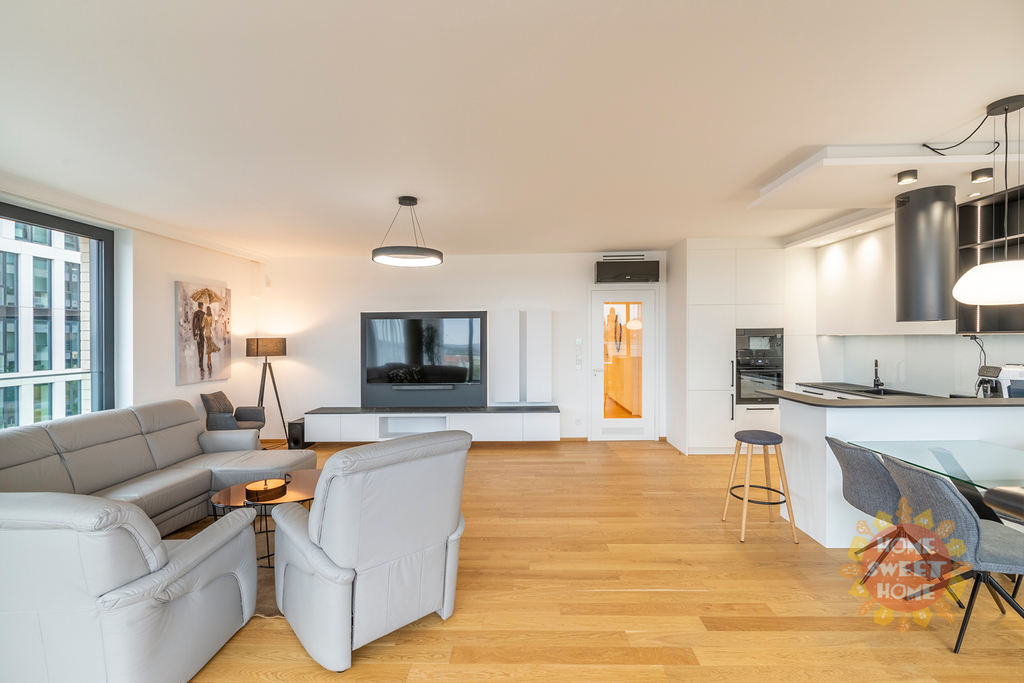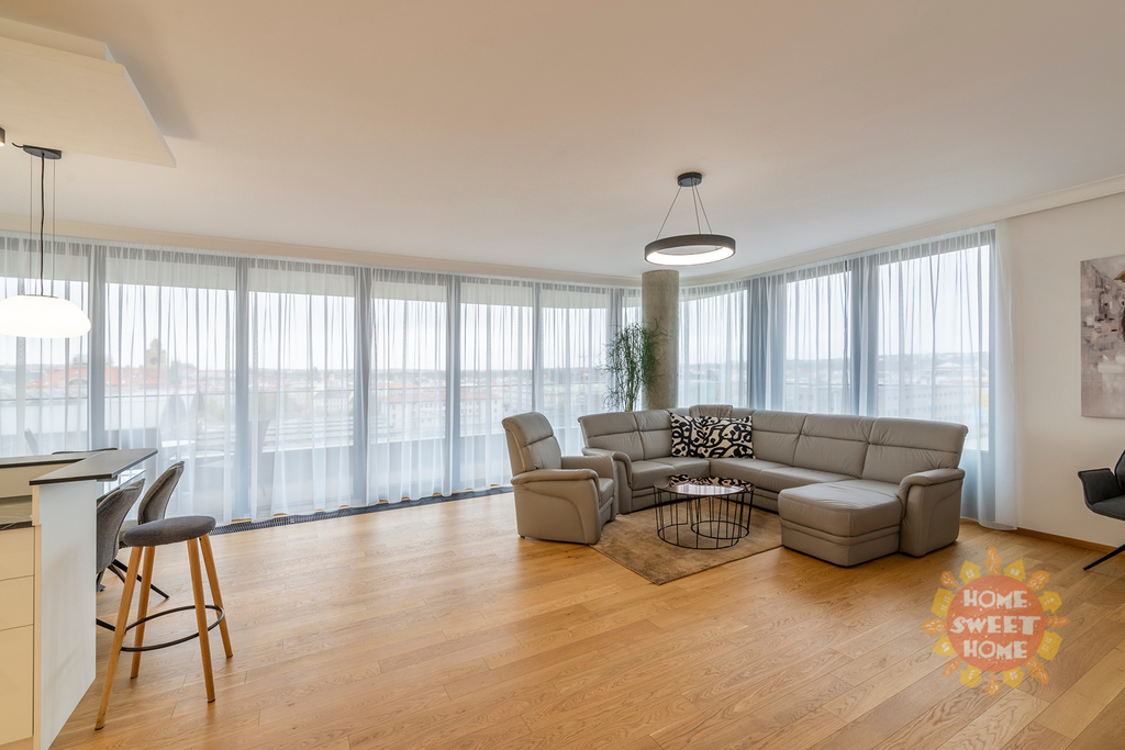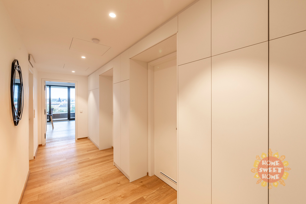 Byt má protihluková okna, na podlaze kvalitní dřevěná podlaha, klimatizace v každé místnosti a bezpečnostní dveře. K bytu patří garážové stání. Byt se nabízí nezařízený a lze jej po dohodě dovybavit veškerým nábytkem.