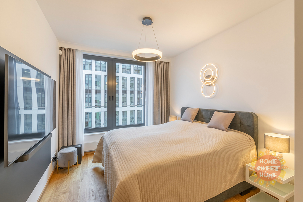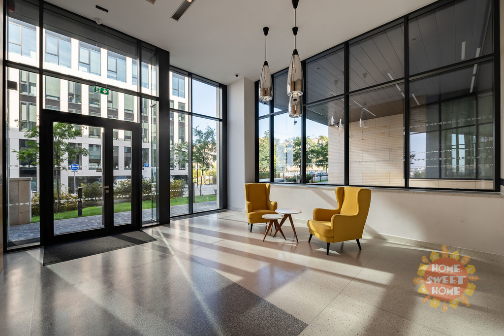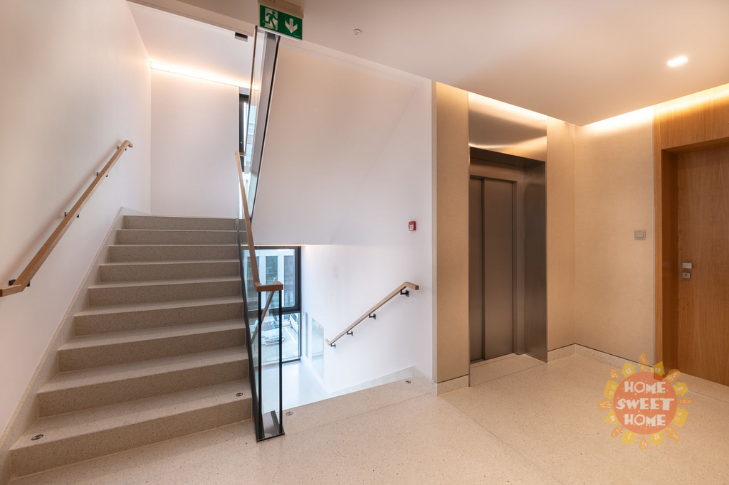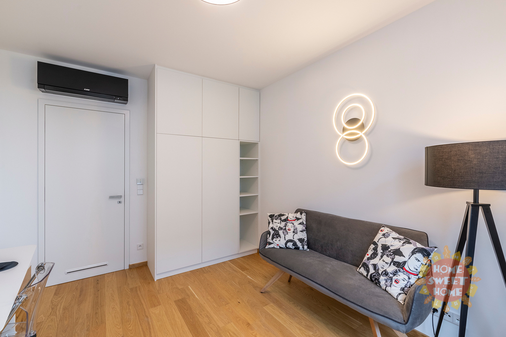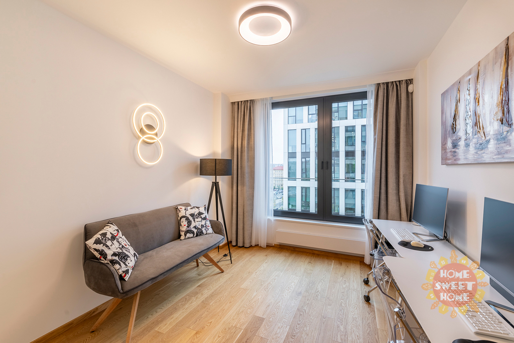 Byt má protihluková okna, na podlaze kvalitní dřevěná podlaha, klimatizace v každé místnosti a bezpečnostní dveře. K bytu patří garážové stání. Byt se nabízí nezařízený a lze jej po dohodě dovybavit veškerým nábytkem.