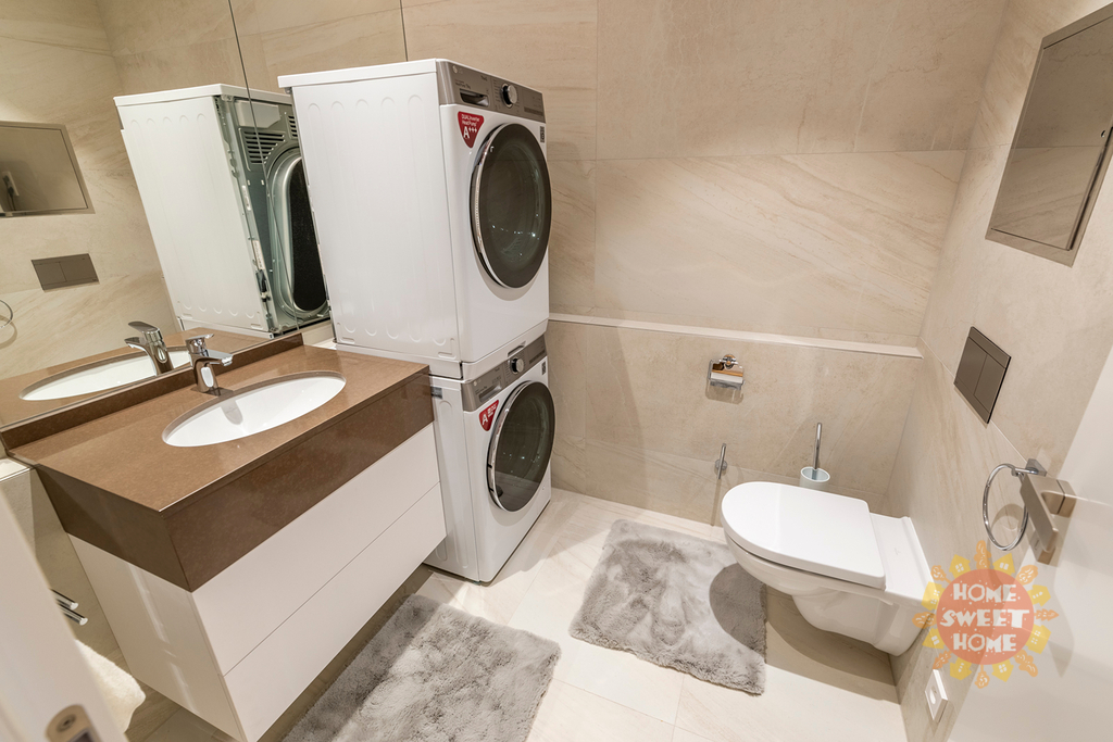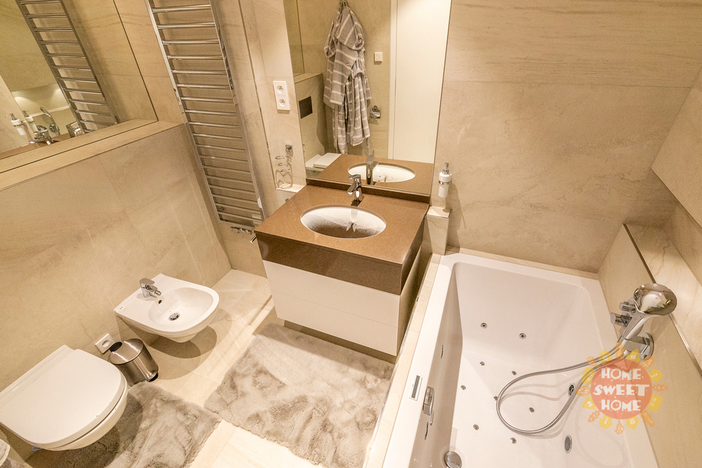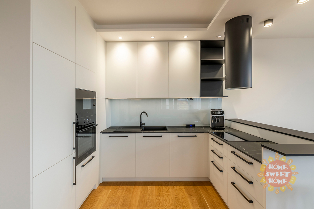 Byt disponuje vstupní chodbou, dvě samostatné ložnice), prostorný obývací pokoj s kuchyňskou linkou vybavenou kvalitními spotřebiči (kuchyňská linka bude instalována během měsíce), dvě koupelny (jedna koupelna se sprchovým koutem, toaletou a přípojkou na pračku, druhá koupelna s vanou a toaletou.