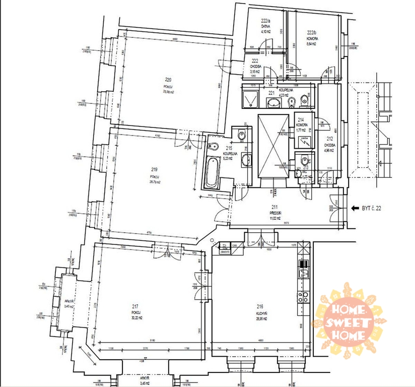 vstupní chodba, rohový obývací pokoj s arkýři, 2 samostatné pokoje, další průchozí pokoj, oddělená kuchyně vybavená veškerými spotřebiči, ostrůvkem (horní skříňky budou dodělány) s dostatečným prostorem pro jídelní stůl, dvě koupelny ( jedna s vanou, druhá se sprchovým koutem a toaletou), další toaleta zvlášť, šatna, technická místnost s pračkou a sušičkou. Na podlaze jsou parkety,