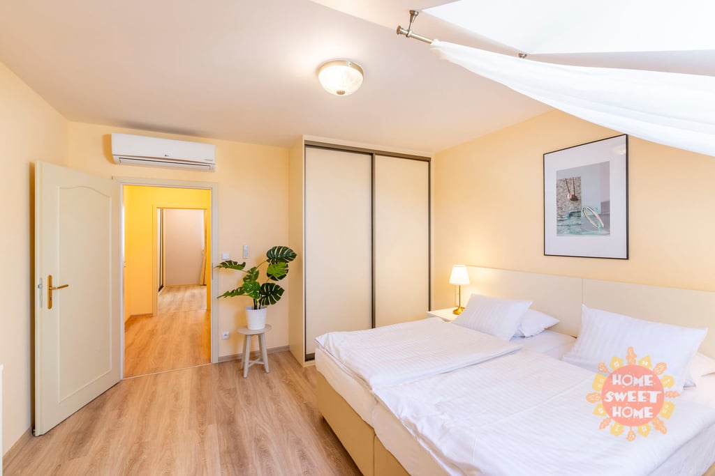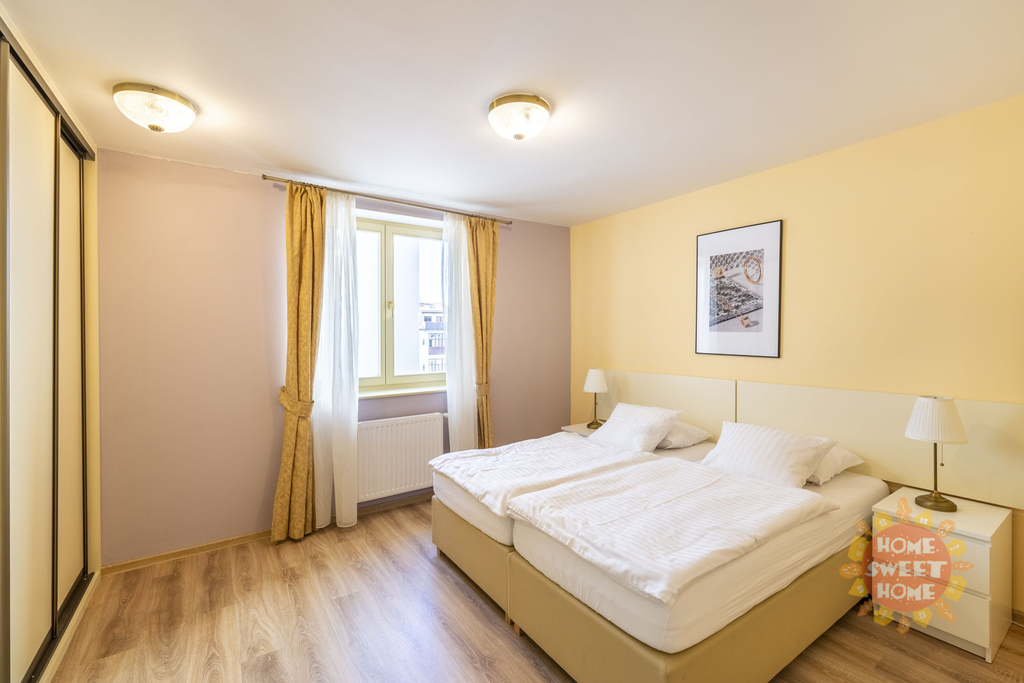 V bytě je vstupní hala, velký obývací pokoj s posezením a TV spojený s plně vybaveným kuchyňským koutem s jídelní částí (digestoř, sklokeramická varná deska, elektrická trouba, mikrovlnná trouba, myčka, lednice, kávovar, toustovač, sada nádobí), 2 samostatné ložnice s dvojlůžky, koupelna se sprchovým koutem, pračkou, sušičkou, toaletou a druhá samostatná toaleta.