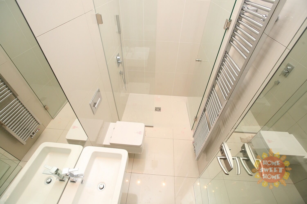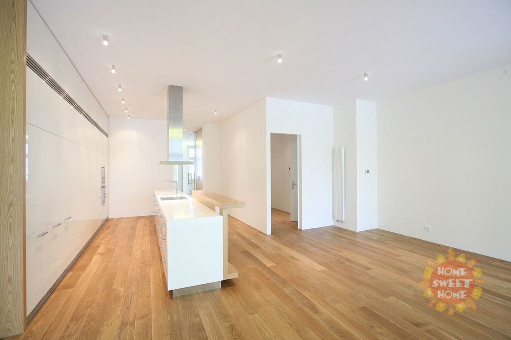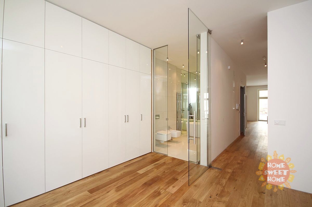 vzdušný obývací pokoj s moderní plně vybavenou kuchyňskou linkou, jídelním prostorem a vstupem na terasu situovanou do vnitrobloku, dvě samostatné ložnice s vestavěnými skříněmi, jedna koupelnou s vanou, druhá koupelna se sprchovým koutem. Dostatek úložného prostoru, v bytě použity kvalitní materiály, dřevěné podlahy, designová dlažba, klimatizace a k dispozici pračka/sušička. Možnost pronájmu parkovacího stání v zakladači za 5.000.