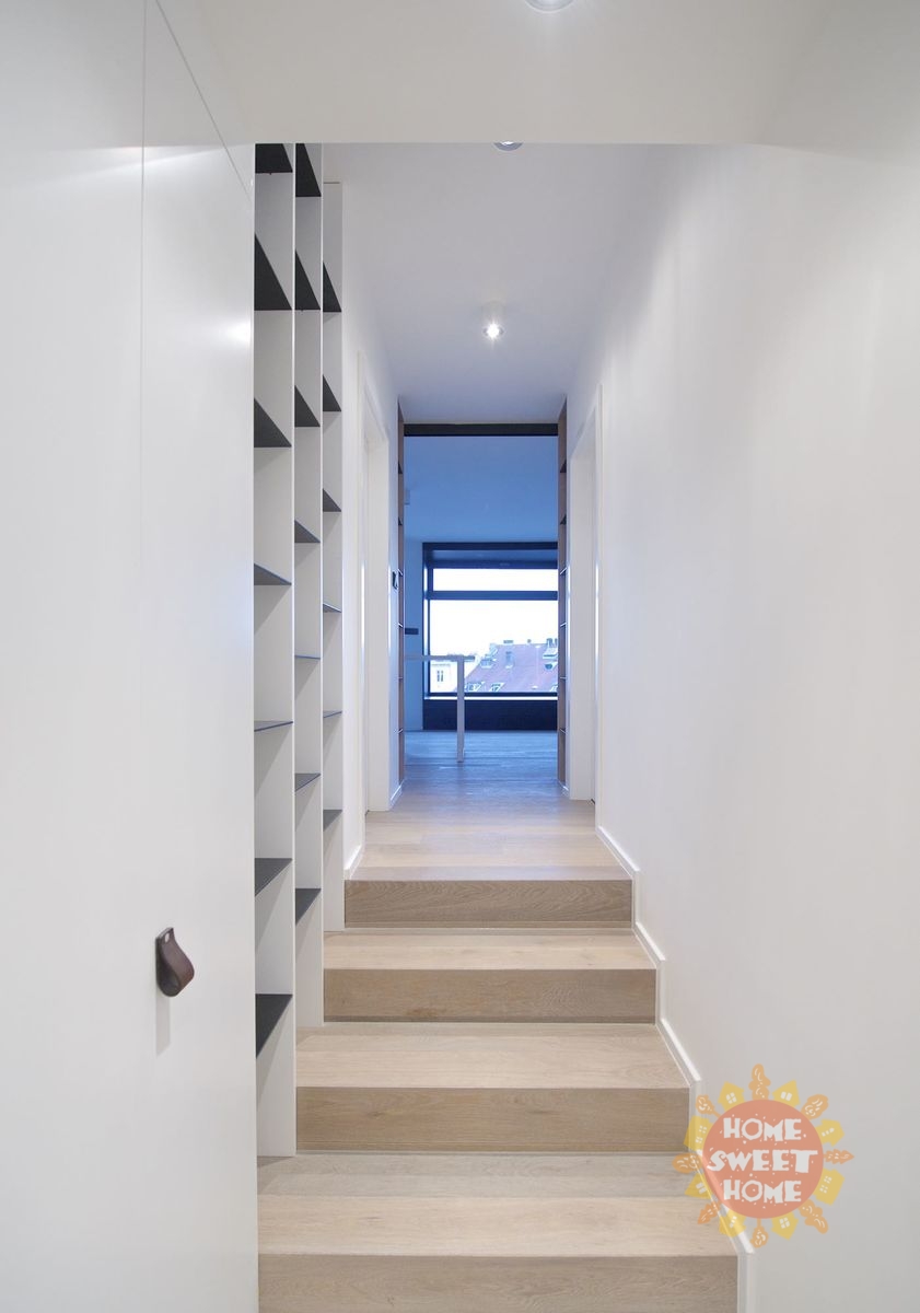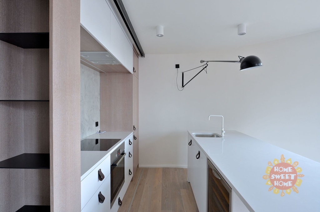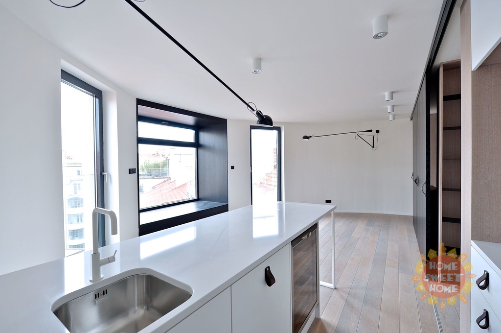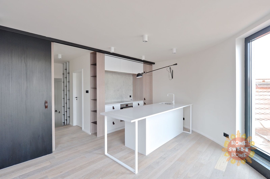Byt je velmi světlý a působí vzdušně, jsou zde velká okna. V bytě jsou použity kvalitní materiály. Na podlaze parkety a dlažba.
