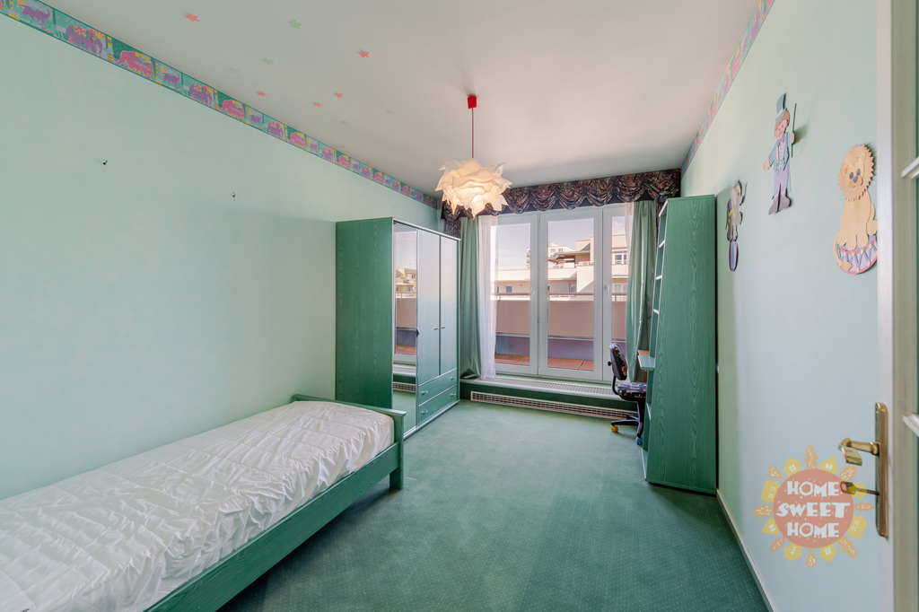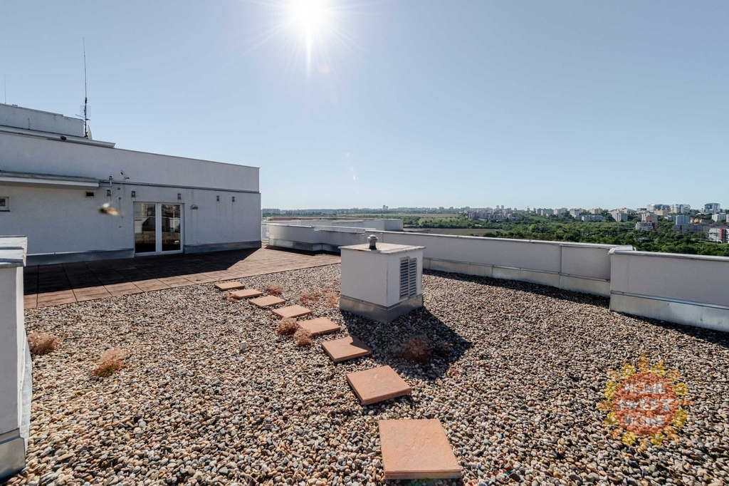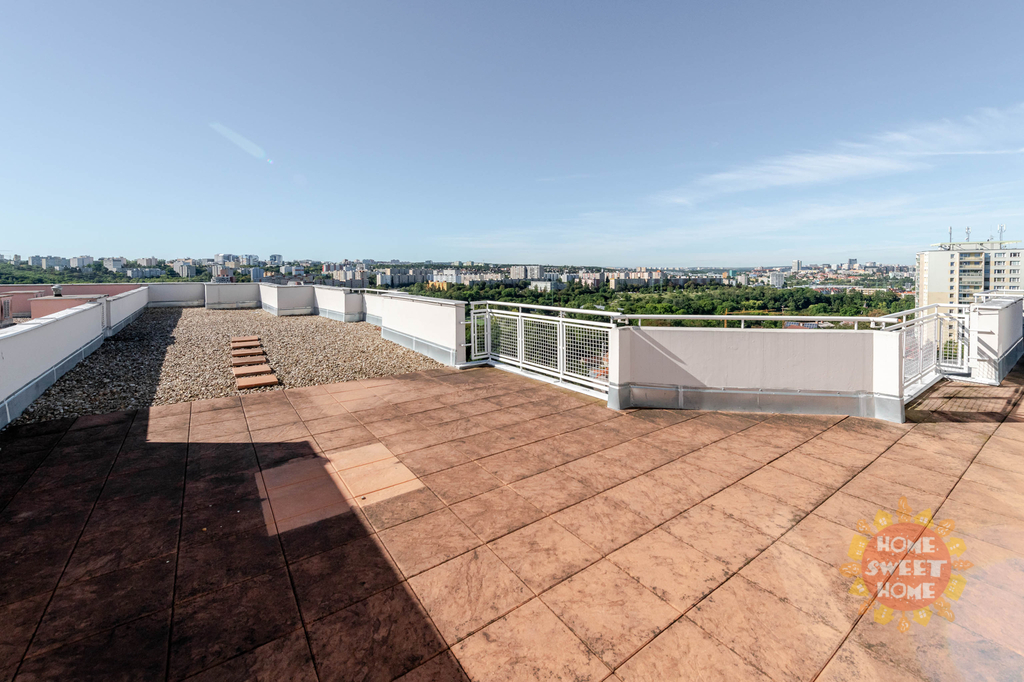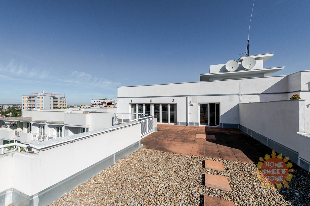 Byt je navržen tak, aby splnil potřeby rodin. Byt je částečně vybavený a sestává ze vstupní chodby, šatny, dvou světlých prostorných ložnic a jednoho dětského pokoje, který lze případně upravit na pracovnu, dvou koupelen s toaletou (sprchový kout a vana), prostorného obývacího pokoje s francouzskými okny a vybaveným kuchyňským koutem (myčka, vestavná lednice s mrazničkou, elektrická varná deska a vestavná pečící trouba). Všechny pokoje mají vlastní vstup na rozlehlou střešní terasovou plochu s krásným panoramatickým výhledem do širokého okolí. Terasa o rozloze neuvěřitelných 150 m² poskytuje ideální místo pro rodinné posezení či grilování v teplých měsících.