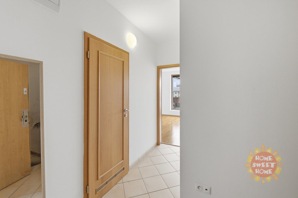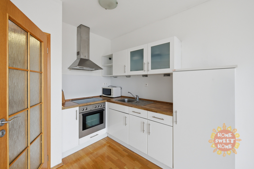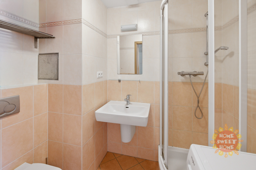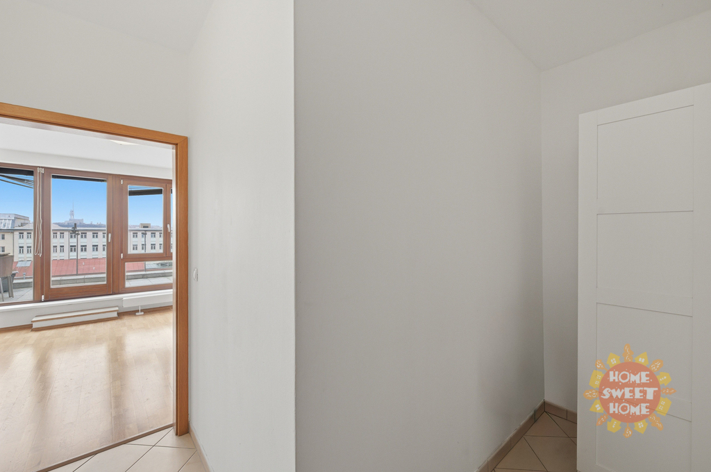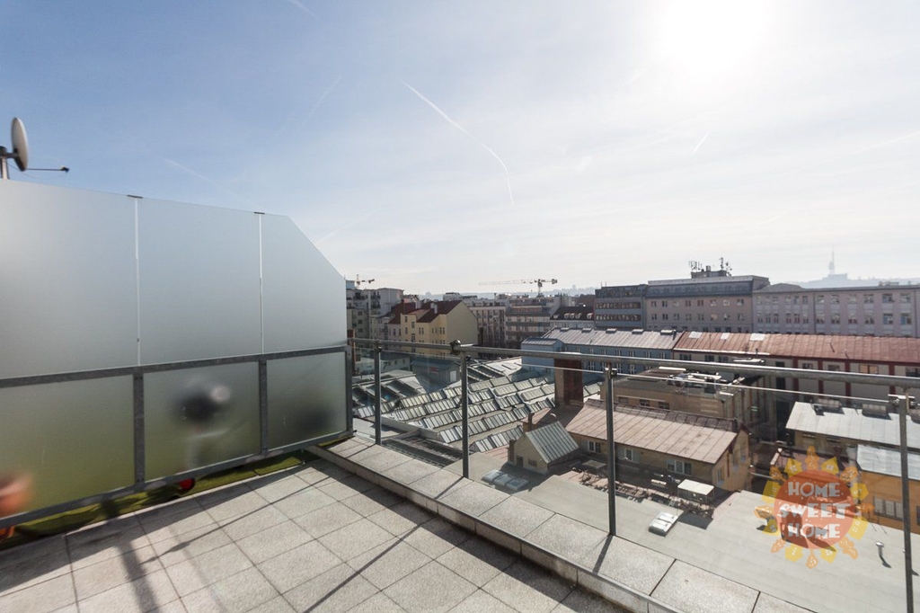 vstupní chodba se skříní, jedna místnost s kuchyňskou linkou (lednice, sklokeramická deska, trouba a myčka), koupelna se sprchovým koutem, toaletou a pračkou. K bytu patří prostorná, na JIH orientovaná terasa 16m2 s fantastickým výhledem (od Žižkovské věže až k Hradu).