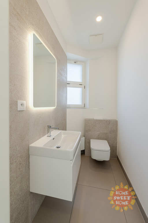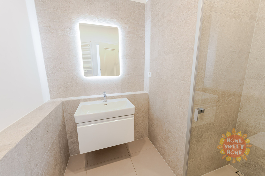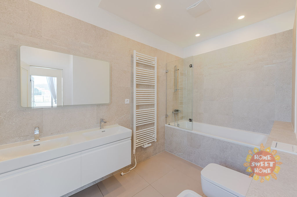 vstupní chodba s vestavěnými skříněmi, pračka a sušička, prostorný obývací pokoj, dvě samostatné ložnice s vestavěnými skříněmi, oddělenou kuchyni vybavenou všemi spotřebiči (lednice, indukční deska, el.trouba, lednice a myčka ), 2 koupelny ( jedna koupelna s vanou, sprchovým koutem, bidetem a toaletou, druhá koupelnu se sprchovým koutem), další toaleta zvlášť a terasa po celé délce bytu. Další vybavení bytu: dřevěné podlahy, dlažba, bezpečnostní dveře, alarm a klimatizace.