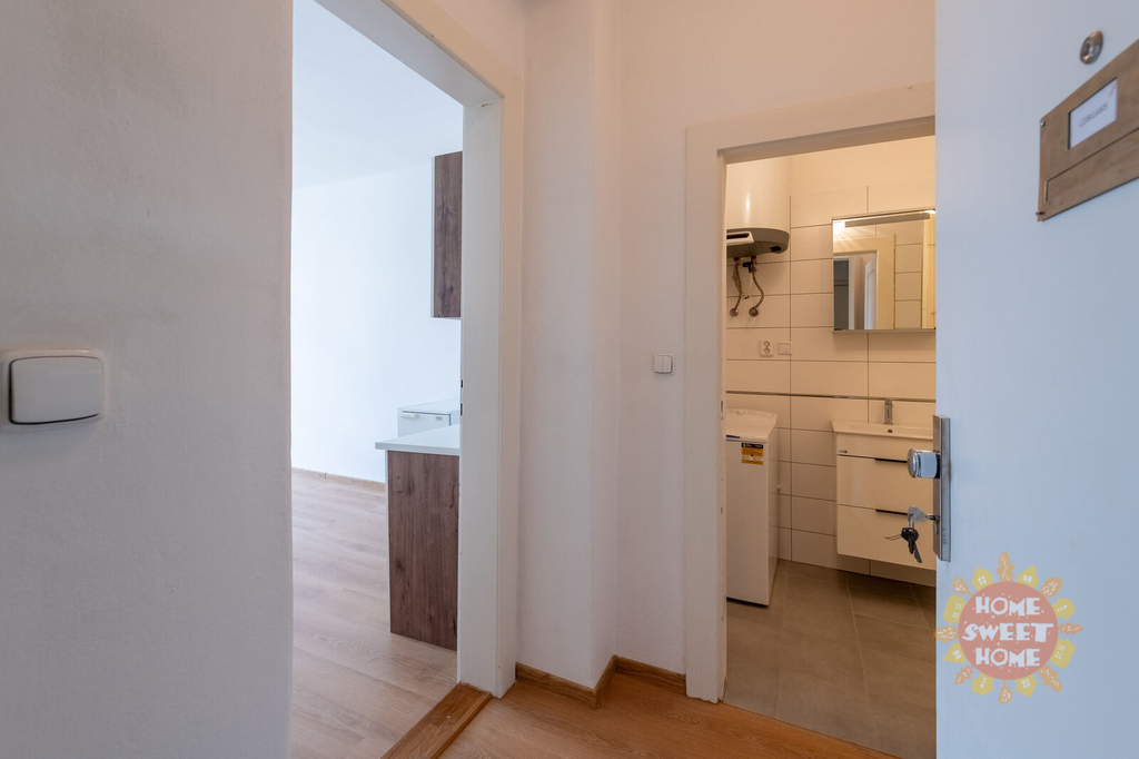 Nabízíme k pronájmu zařízený byt 1+kk o celkové ploše 22 m², který se nachází v 5. nadzemním podlaží cihlového domu s výtahem v ulici Hradešínská, Praha 10 – Vinohrady. Byt se skládá ze vstupní chodby, obytné místnosti s kuchyňským koutem, šatny a koupelny se sprchovým koutem a pračkou. Toaleta je samostatná. Byt prošel částečnou rekonstrukcí, včetně kompletně zrekonstruované koupelny. V pokoji je jednoduchá kuchyňská linka, lednice, postel a jídelní stůl. Byt je orientován na sever s výhledem do zahrad rezidenčního komplexu Korunní dvůr.